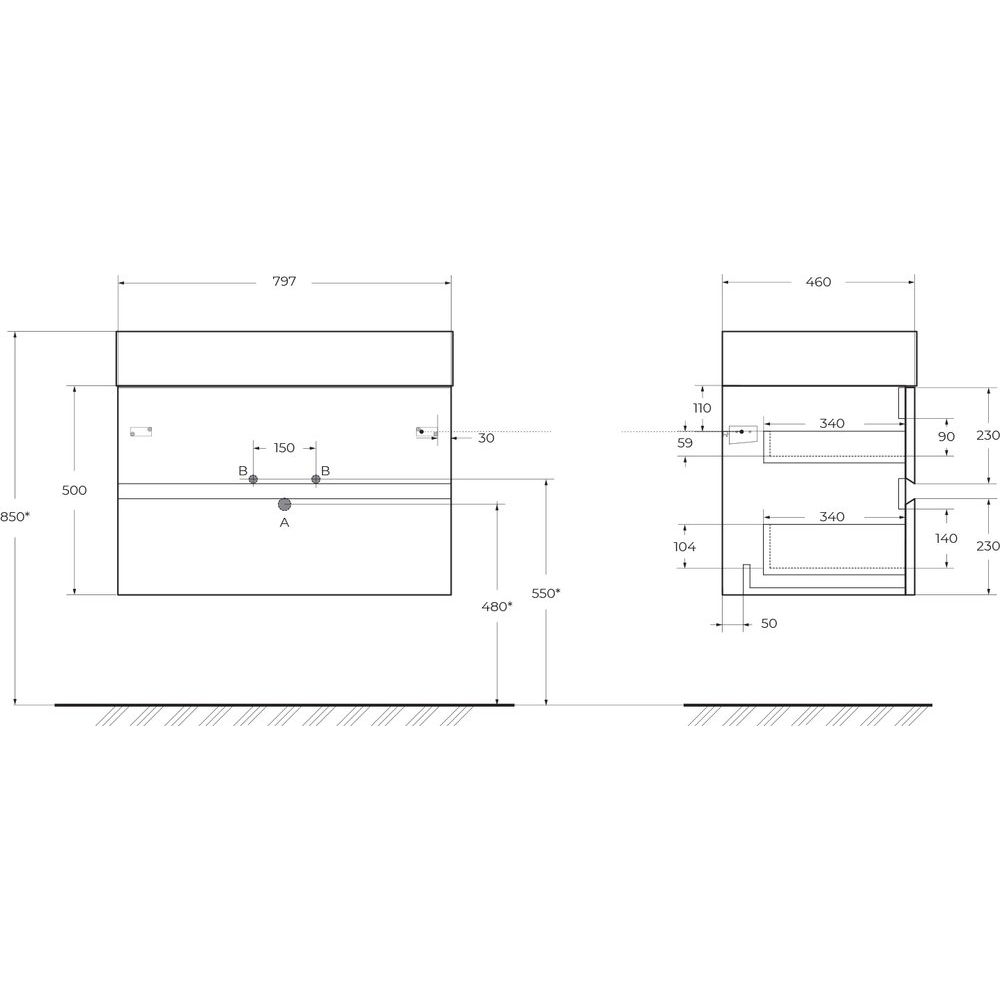 - Подвесная конструкция тумбы и зеркала создает дополнительное пространство и облегчает уборку.