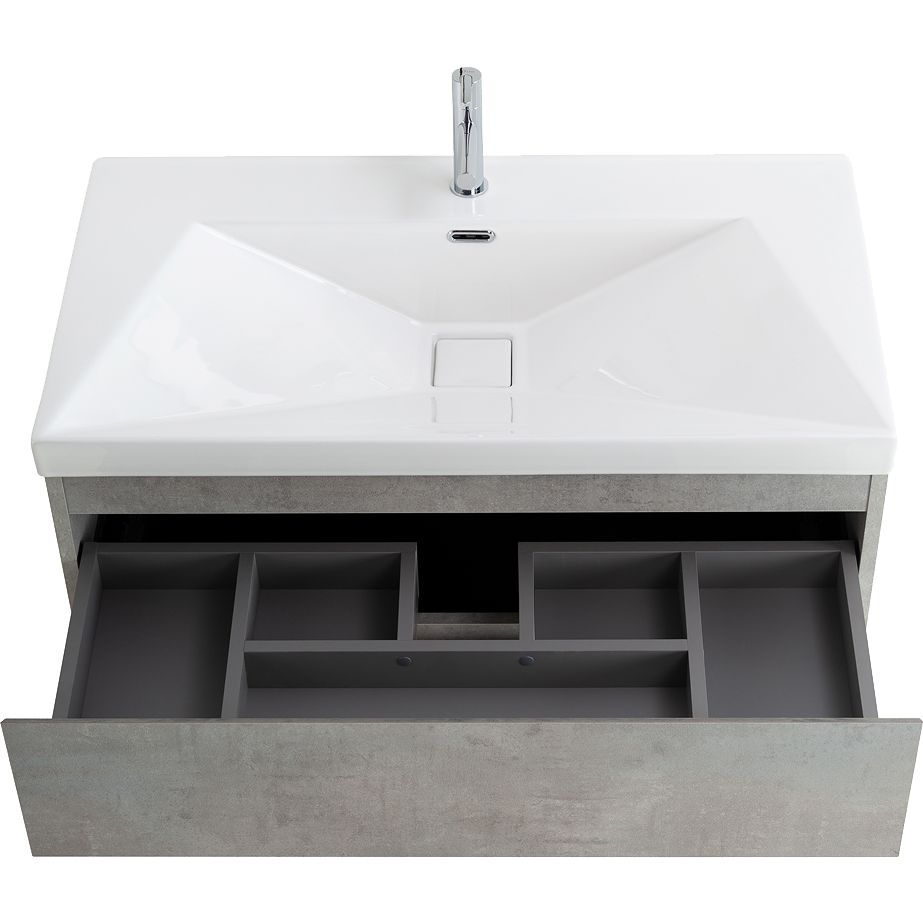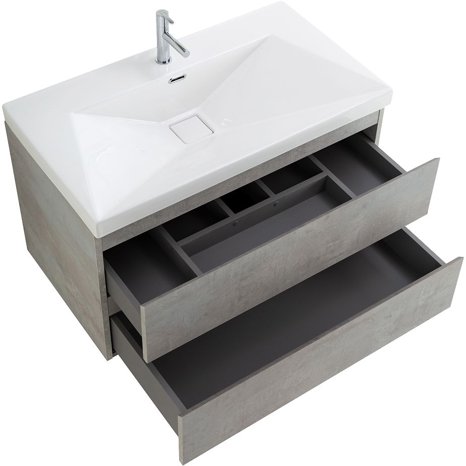 Комплект мебели состоит из трех основных элементов: подвесной тумбы Cezares Molveno 90 с размерами 89,6x49,8x50 см, которая выполнена из качественного ЛДСП и покрыта ламинатом для защиты от влаги и повреждений. Тумба оснащена механизмом доводчика, обеспечивающим плавное закрывание ящиков.