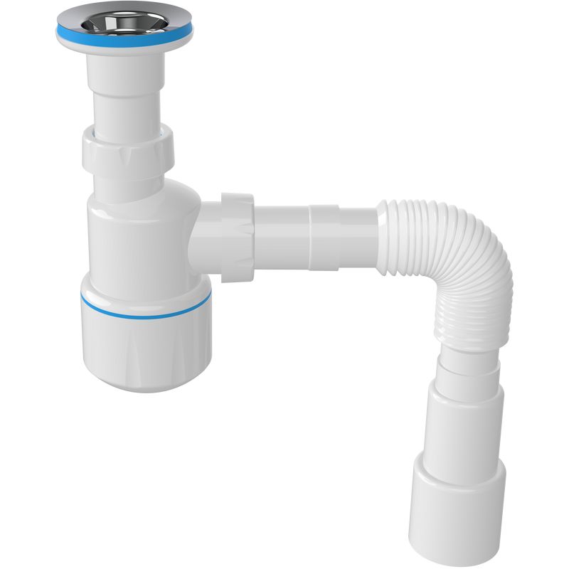 Сифон для биде EWRIKA 5055860 выполнен из полипропилена с боковым выпуском и мокрым затвором, предотвращающим неприятные запахи. Его размеры составляют 16x10 см, а регулировка по высоте — до 5 см.