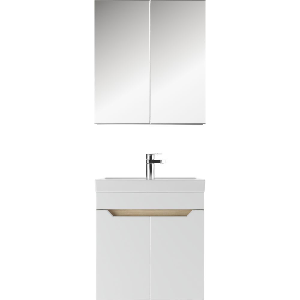 - Комплектация включает все необходимое: тумбу, раковину, сифон и зеркало-шкаф.