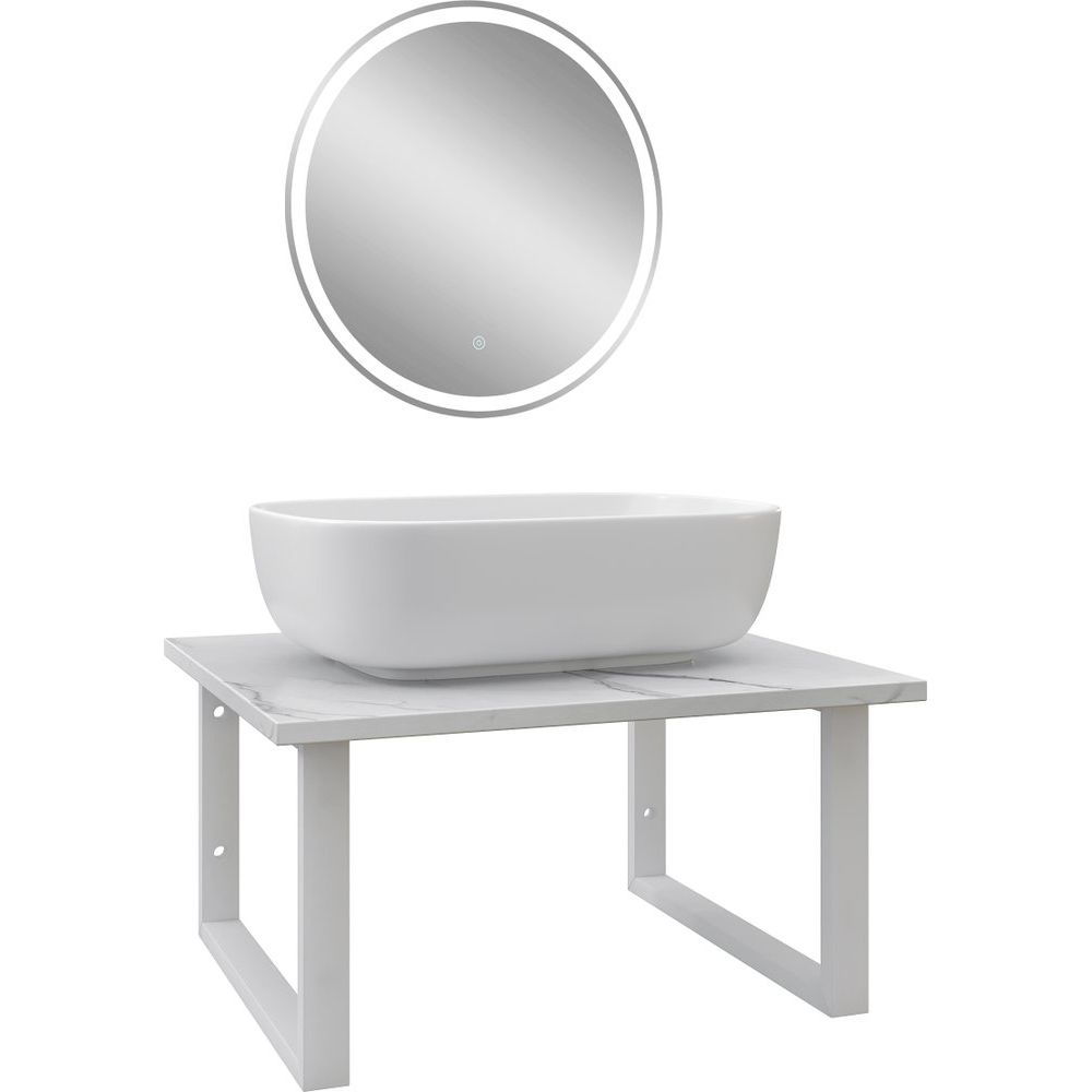 Ощутите свежесть и простор вашей ванной комнаты с гарнитуром DIWO «Элиста 60». Необычное дизайнерское решение — использование столешницы вместо массивной тумбы — делает этот комплект уникальным и стильным. Детализированный оттенок белого мрамора добавит элегантности и современности, а белая раковина Moduo 50 Square станет идеальным акцентом благодаря своей простоте и удобству в уходе.