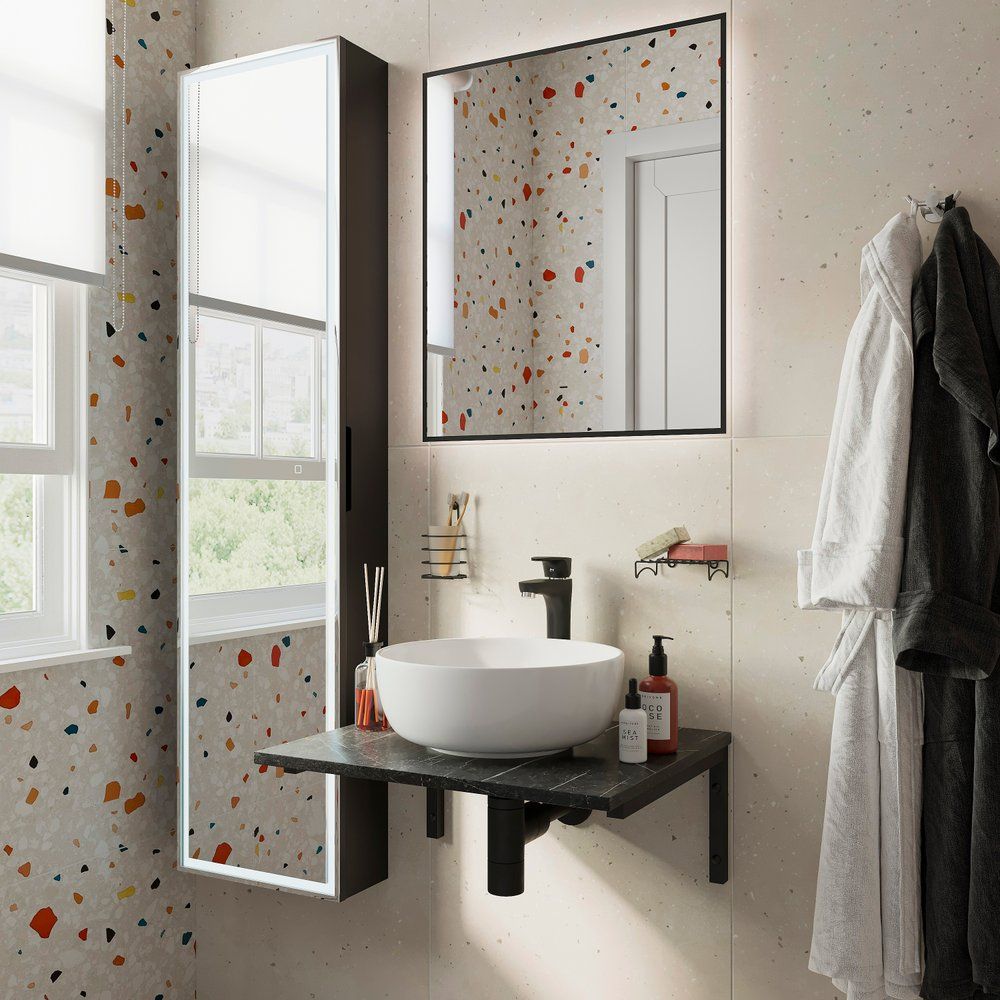 Мебель для ванной DIWO «Элиста 60» в оттенке чёрного мрамора — это изысканное решение для вашего интерьера, будь то минимализм или скандинавский стиль. Этот компактный гарнитур, рассчитанный на рациональное использование пространства, привнесёт в вашу ванную ощущение свободы. Столешница из МДФ защищена от влаги благодаря износостойкой пленке, что обеспечивает долговечность и стильный вид. Прямоугольное зеркало с подсветкой и чёрной окантовкой подарит вам чёткое отражение, его яркость легко регулируется простым движением руки. Надежная накладная раковина-чаша DIWO Moduo 40 RING из белоснежного фарфора завершает ансамбль этой стильной коллекции.