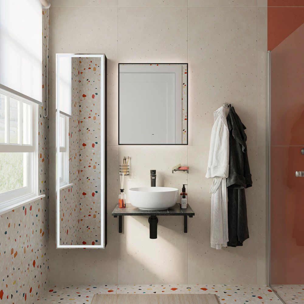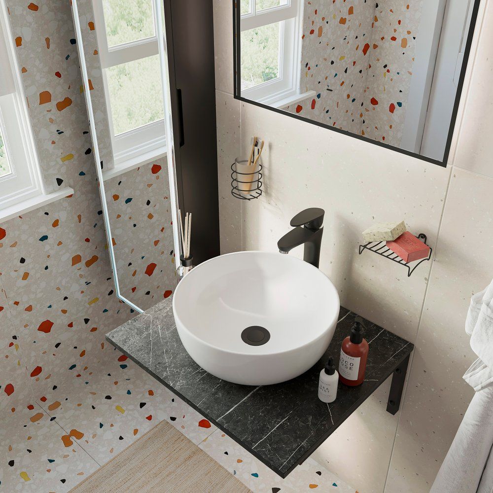 Раковина Cersanit Moduo 40 RING имеет размеры 40x40 см и выполнена из лёгкого в уходе фарфора, предназначена для сифона диаметром 3.2 см. Столешница DIWO 60, в цвете чёрный мрамор, выделяется прочной конструкцией из МДФ и износостойкой плёнкой. Для надёжного подвесного монтажа применяются стальные чёрные держатели. Прямоугольное зеркало STWORKI с чёрной рамой и без подсветки прекрасно дополнит интерьер.