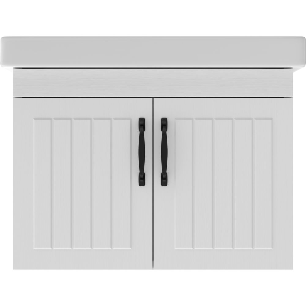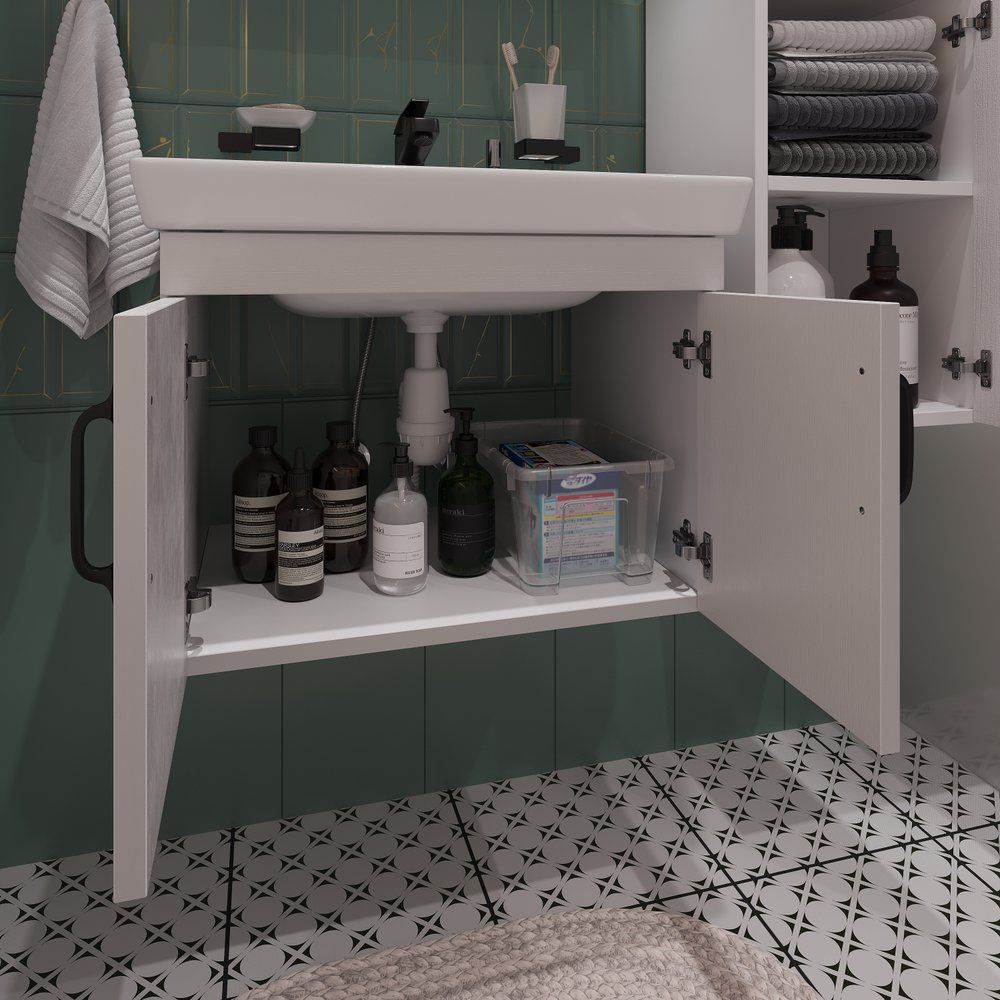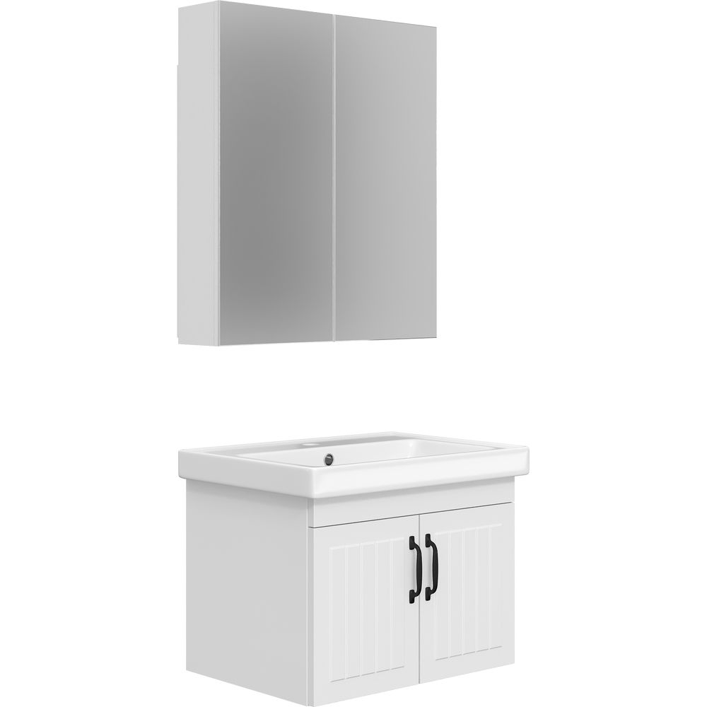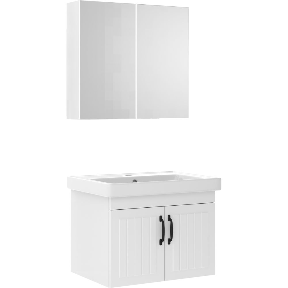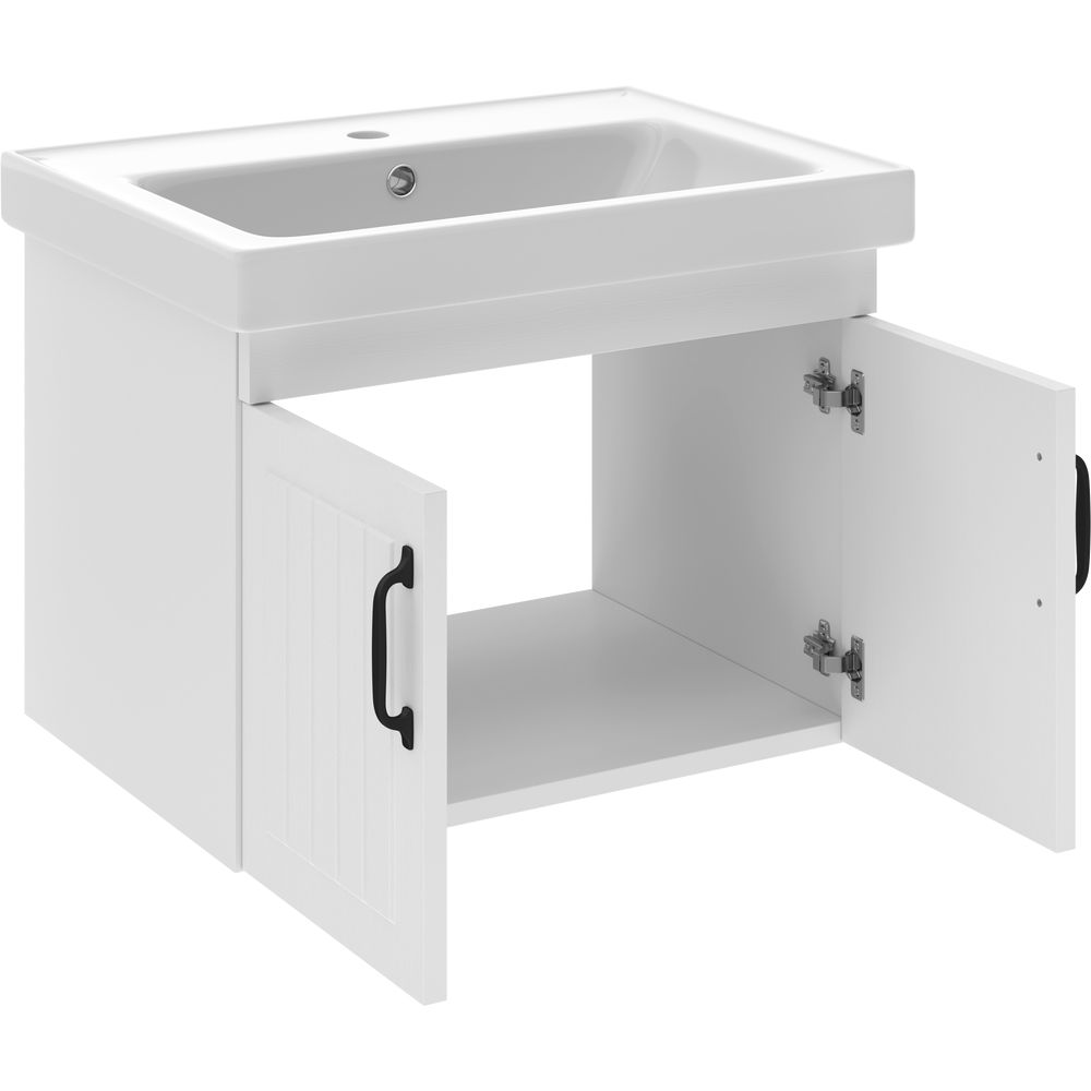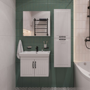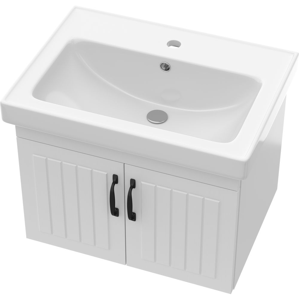 Гарнитур включает подвесную тумбу DIWO Сочи 60, габариты которой составляют 55,6x41,4x40 см. При изготовлении корпуса использованы прочные ДСП с пленочным покрытием, а фасады выполнены из МДФ, что подчеркивает современный стиль мебели. Дверки оснащены механизмом доводчика для бесшумной работы, а функциональность гарантируют несъемные полки.