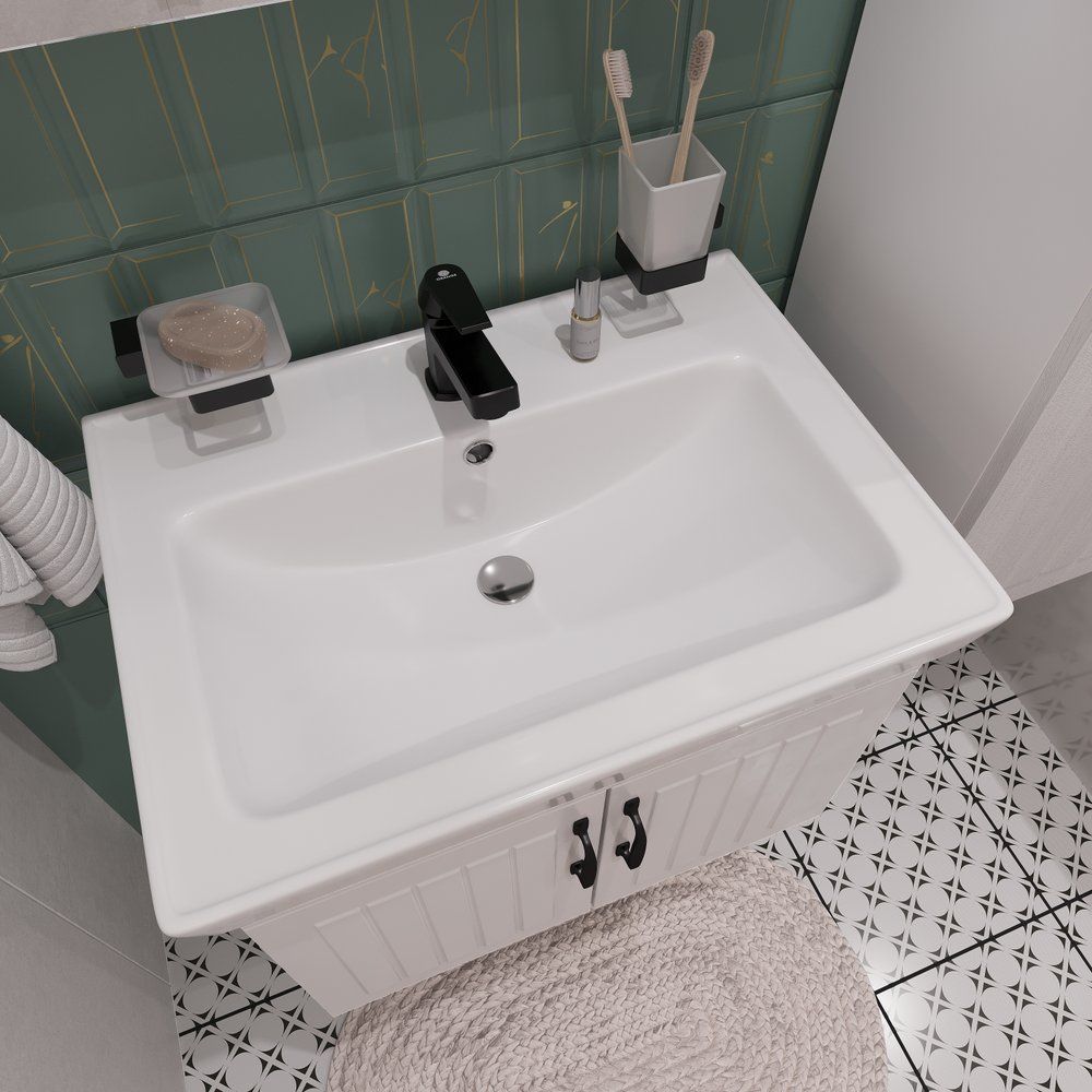 Мебельная раковина в комплекте имеет размеры 60x43,5 см и сделана из высококачественного фаянса, легкого в уходе. Встроенный слив-перелив облегчит монтаж, а отверстие под смеситель добавит удобства. Обратите внимание, что донный клапан приобретается отдельно.