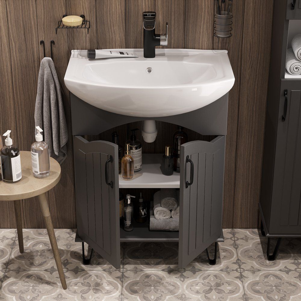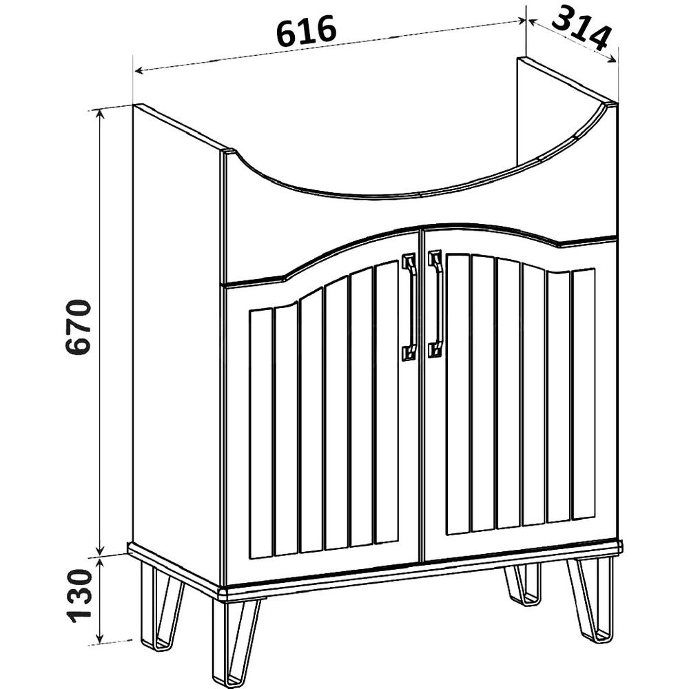 Комплект мебели включает тумбу с размерами 61,6x31,4x80 см, выполненную из ДСП и МДФ с пленочным покрытием, антрацитовой отделкой и черной фурнитурой. Тумба оснащена дверками и несъемными полками, а также опорными ножками для устойчивости, что делает её напольной.