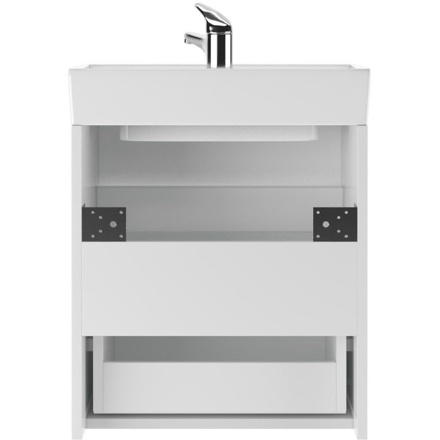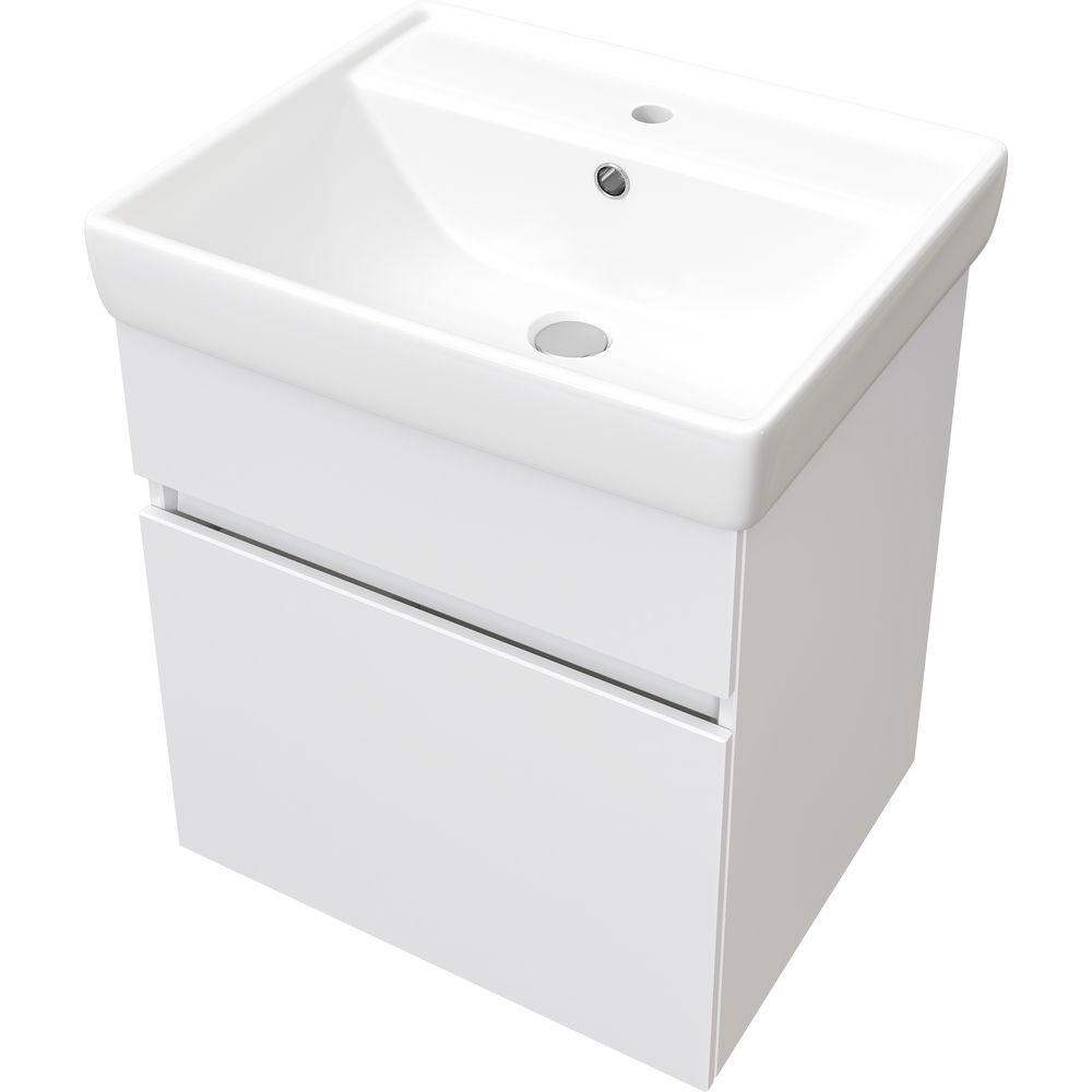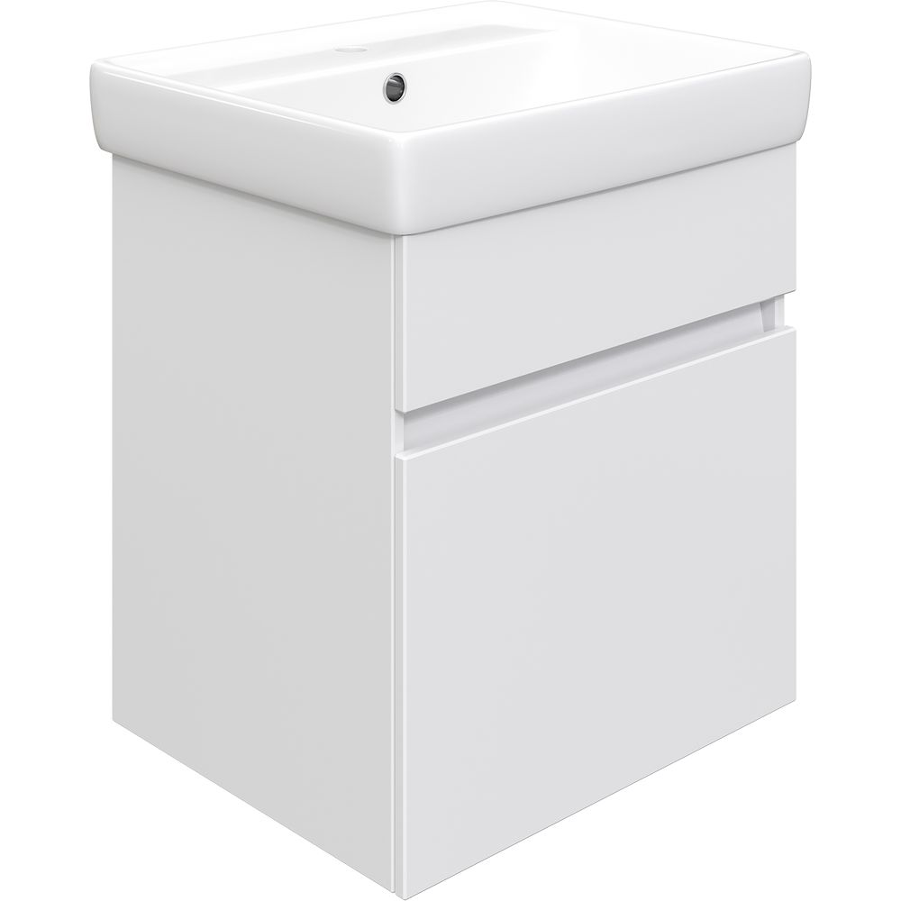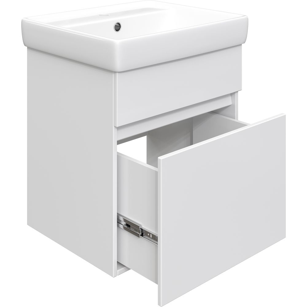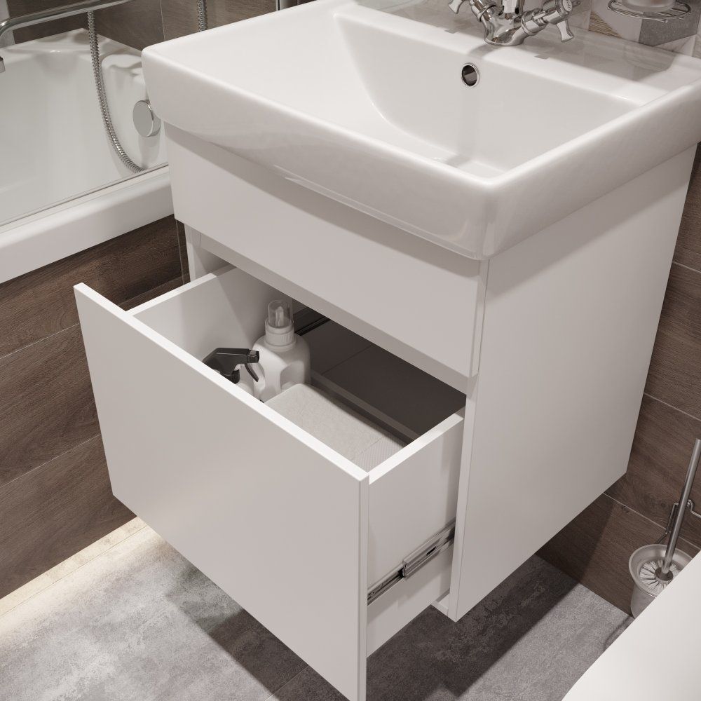 Тумба для комплекта DIWO Тольятти 50 имеет габариты 47x38,75x50 см и выполнена из ЛДСП с пленочным покрытием. Подвесной монтаж делает её эксплуатацию особенно удобной. Фасад изготовлен из МДФ с аналогичным покрытием, что обеспечивает защиту от влаги и механических воздействий.