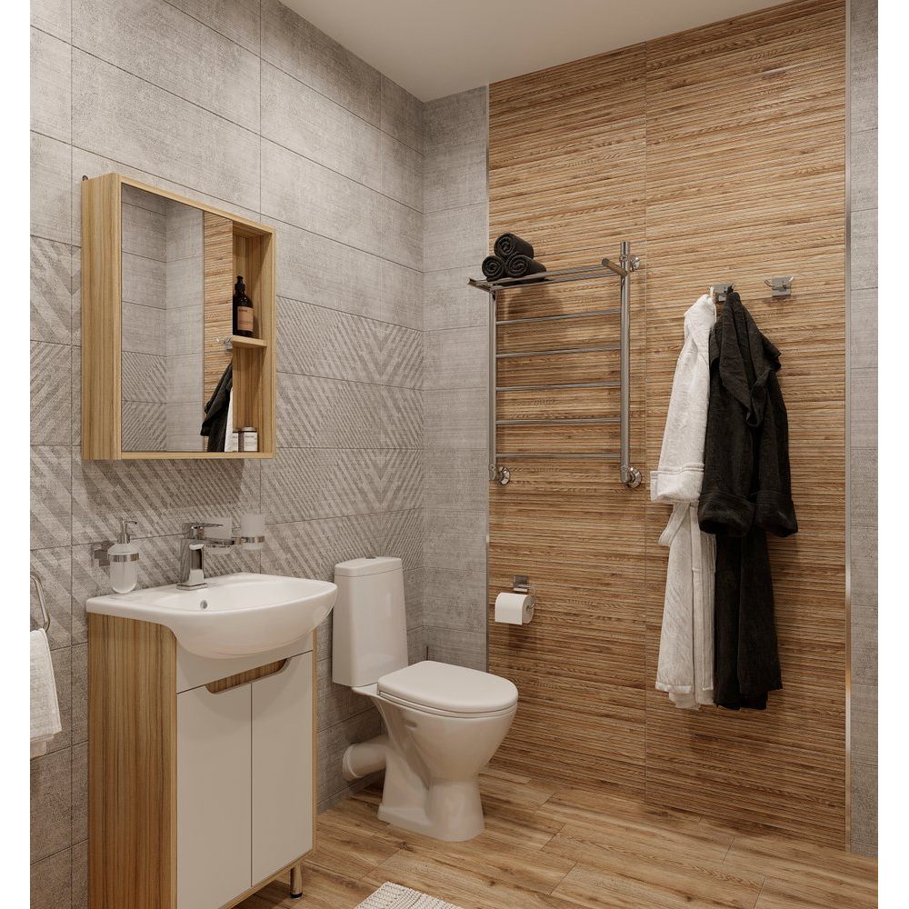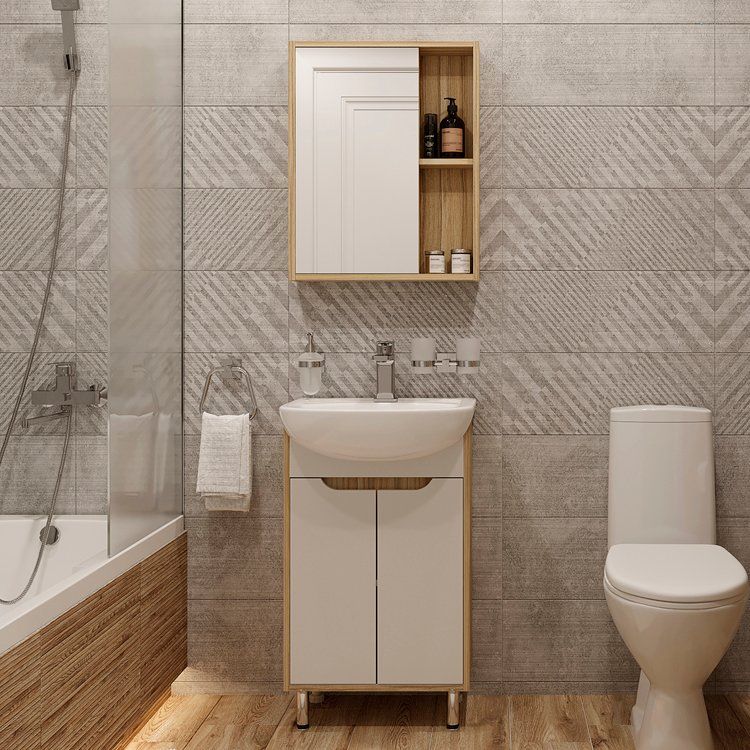 Сочетание белого цвета с древесными оттенками делает мебельный гарнитур DIWO «Углич 50» стильным и функциональным решением для ванной комнаты. Изделие выполнено в скандинавском стиле, что подчеркивает его лаконичность и простоту. Встраиваемые ручки и компактные размеры позволяют гармонично организовать пространство даже в небольшой ванной. Тщательно продуманная система хранения включает тумбу, зеркальную створку и открытые полки, предоставляя достаточно места для всех необходимых вещей. Гарнитур комплектуется фаянсовой раковиной, обеспечивающей легкость в уходе и долговечность. Это идеальный выбор для тех, кто ценит функциональность и эстетику в интерьере ванной комнаты.