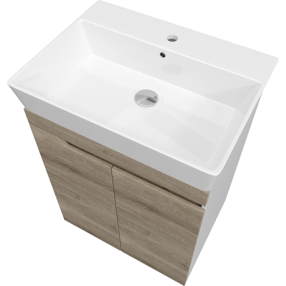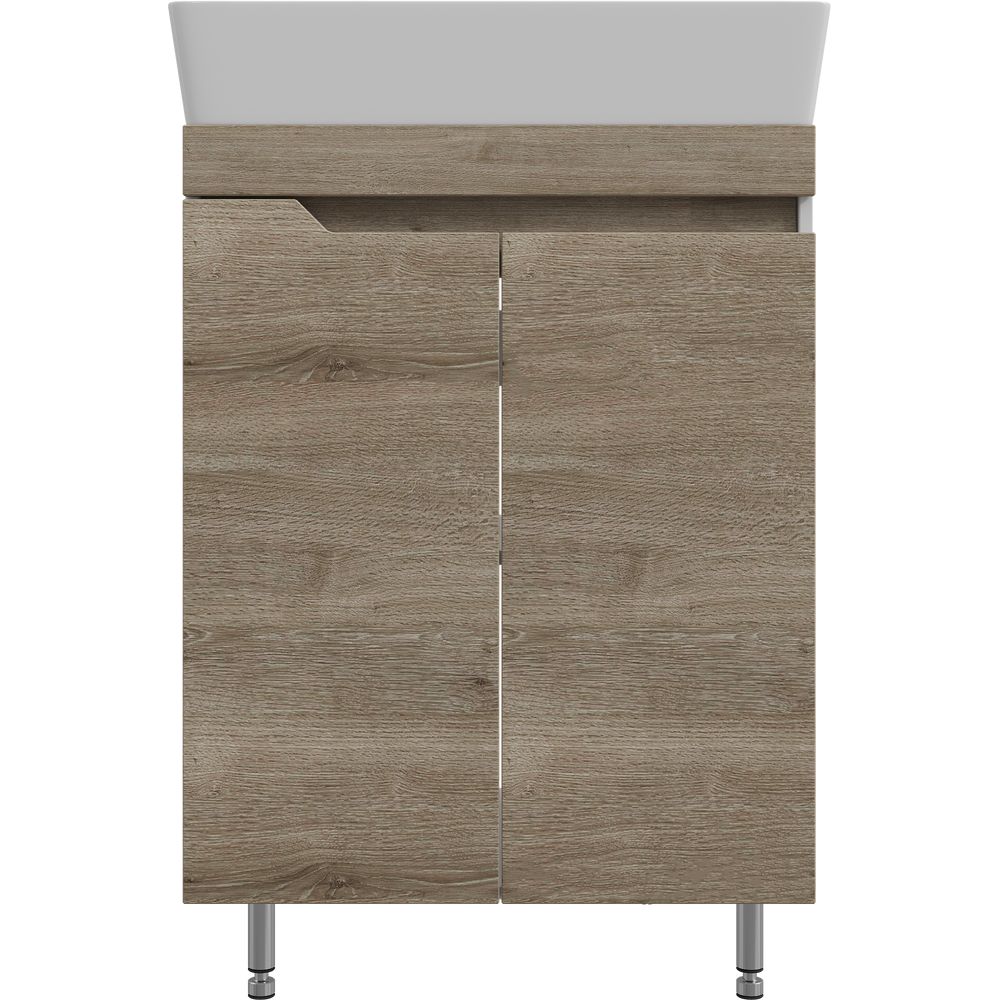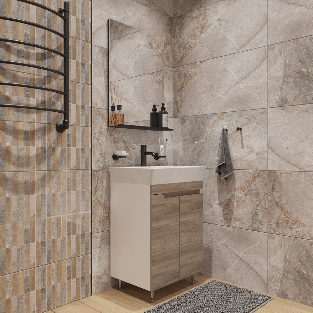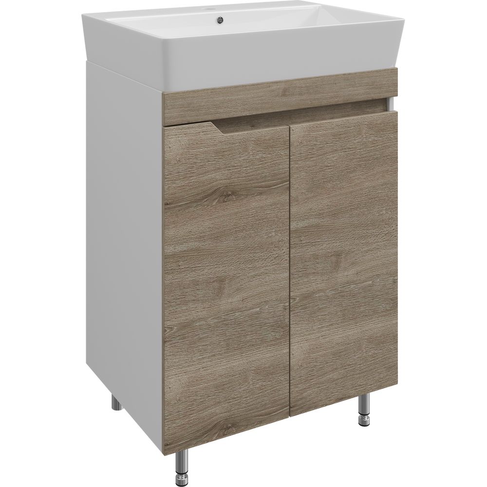 Гарнитур для ванной комнаты DIWO Воронеж включает напольную тумбу размером 57x43x79 см из ДСП с ламинатным покрытием и фасадом из МДФ. Внутренние полки несъемные, а двери оснащены механизмом доводчика. Комплект дополнен мебельной раковиной DIWO Архангельск размером 60x45 см из фаянса, предназначенной для подвешивания, и оснащенной одним готовым отверстием под смеситель. Для раковины предусмотрен сифон АНИ пласт с боковым выпуском, гидрозатвором и антикоррозийным покрытием, регулирующийся по высоте и длине. Настенное зеркало STWORKI Ольтен 60 размером 59x15x80 см подчеркнет скандинавский стиль вашего интерьера, выполнено оно из ДСП/МДФ и покрыто пленкой/ламинированной поверхностью.