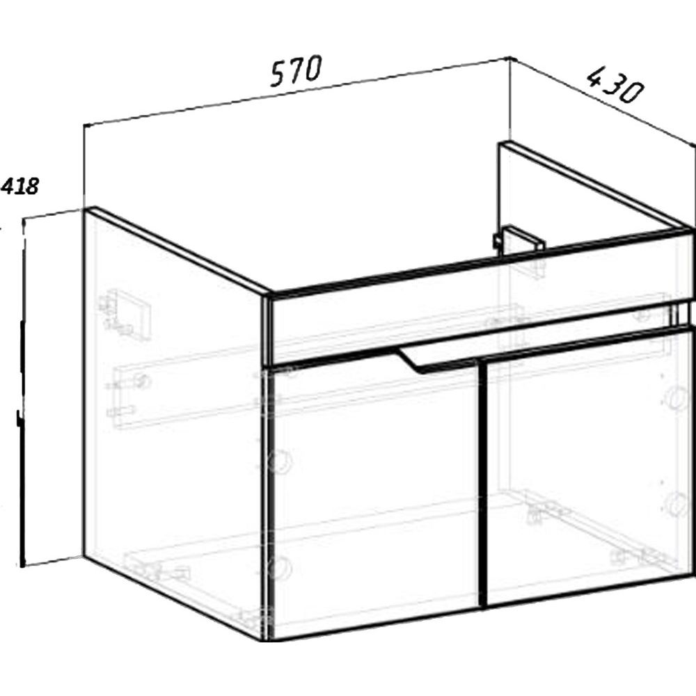 Тумба: выполнена из ДСП с покрытием из пластика и пленки, имеет размеры 57x43x41,8 см. Подвесная конструкция делает её идеальной для эргономичной ванной комнаты.