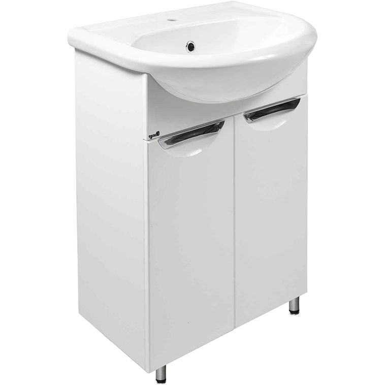 - Тумба: Размеры 59x30x79 см. Корпус из ЛДСП с покрытием пленкой и ламинатом, белый цвет с хромированной фурнитурой. Навесная конструкция и несъемные полки.