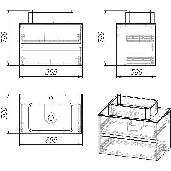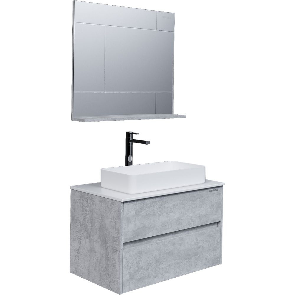 В комплект входит тумба с габаритами 80x50x53 см, выполненная из ЛДСП с ламинатным покрытием, идеально подходящая для раковин-чаш. Она подвесная и оснащена механизмом доводчика, что обеспечивает плавное и бесшумное закрывание ящиков. Раковина Grossman GR-3031 размером 61x33,5 см изготовлена из фаянса. Зеркало из той же коллекции 80x14,5x71,6 см имеет подвесное крепление и также выполнено из ЛДСП с ламинатным покрытием.