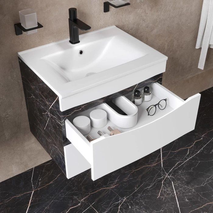 Комплект включает в себя подвесную тумбу Cloud 60, белую с черным мрамором, с размерами 60,3x45,5x50 см. Тумба оснащена механизмом доводчика для плавного закрывания, изготовлена из ЛДСП с пластиково-ламинированным покрытием и фасадом из МДФ с эмалью. В комплектацию также входит мебельная раковина из фарфора размером 60x46,5 см с сифоном диаметром 3.2 см и необходимой арматурой для слива-перелива. Завершает ансамбль зеркало Cloud 60 с эмалированным стальным корпусом размером 60,2x3,5x70,2 см, снабженное подсветкой и термообогревом.