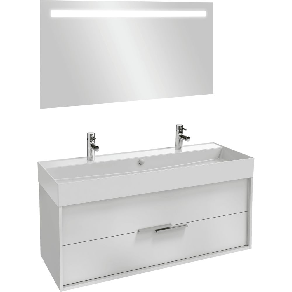 Тумба Jacob Delafon Vivienne имеет размеры 119,9x45,2x45,2 см. Она подвесная, что обеспечивает экономию пространства, с плавно закрывающимися ящиками и фасадом с хромированными ручками. Раковина Jacob Delafon, размером 121,2x46,6 см, выполнена из высококачественного фарфора и монтируется на стену. Она снабжена встроенным сливом-переливом и двумя отверстиями под смеситель, что делает ее функциональной и удобной в использовании. Зеркало STWORKI Скаген с подсветкой и размерами 120x3x80 см обладает инфракрасным управлением, что добавляет комфорта.