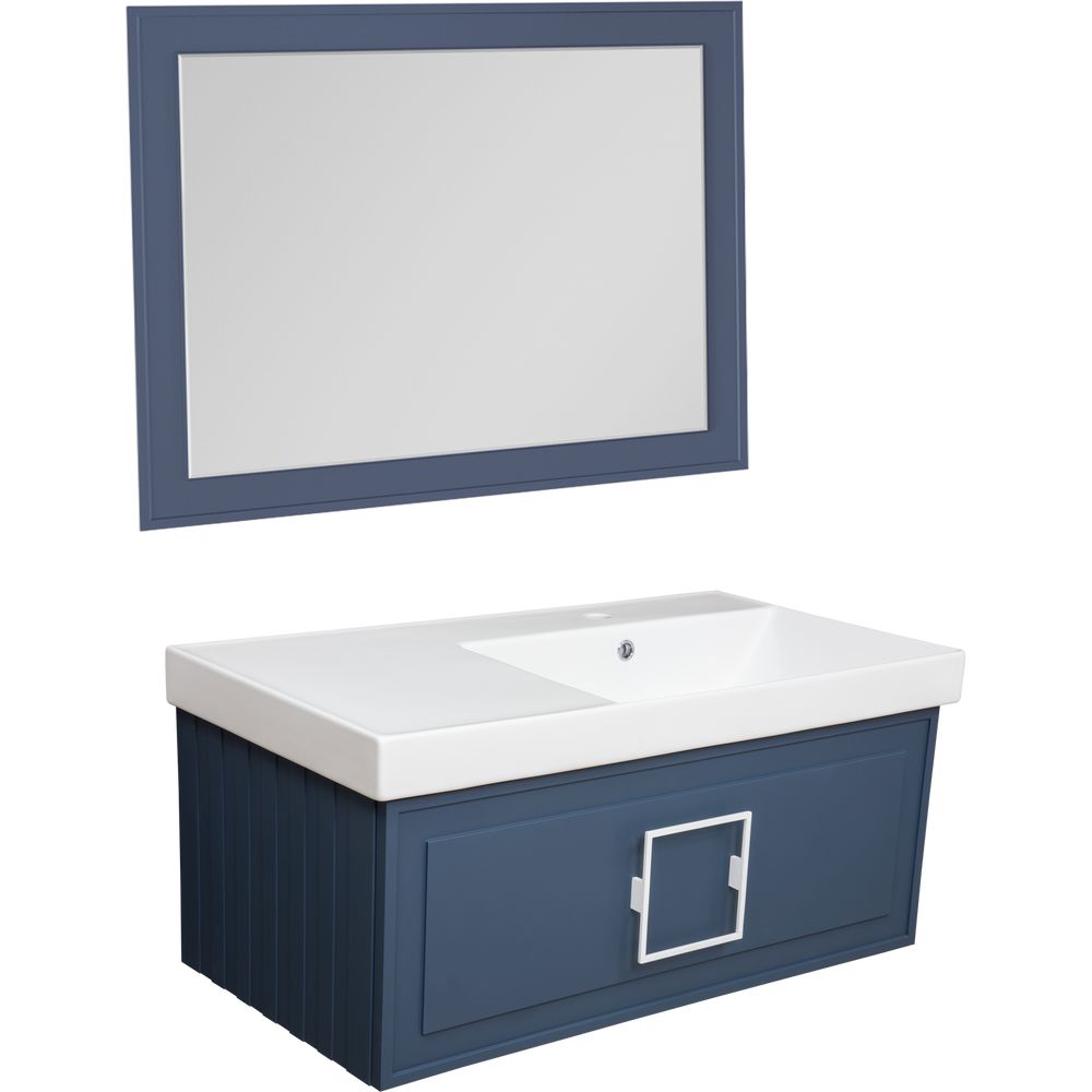 Мебель для ванной La Fenice Cubo 90 R синего цвета с белыми ручками воплощает в себе эстетичное совершенство и функциональный комфорт. Эта коллекция сочетает в себе современные технологии и элегантный дизайн, подходит для стильных и уютных ванных комнат. Отделка с применением эмали подчеркивает благородство материала и долговечность мебели.