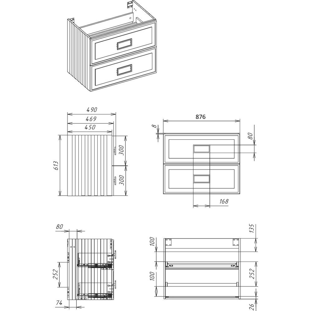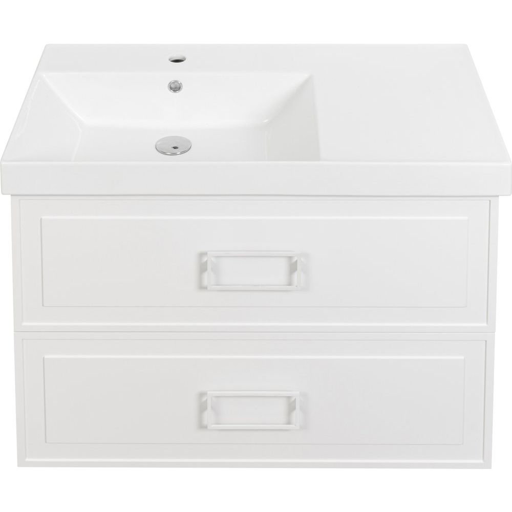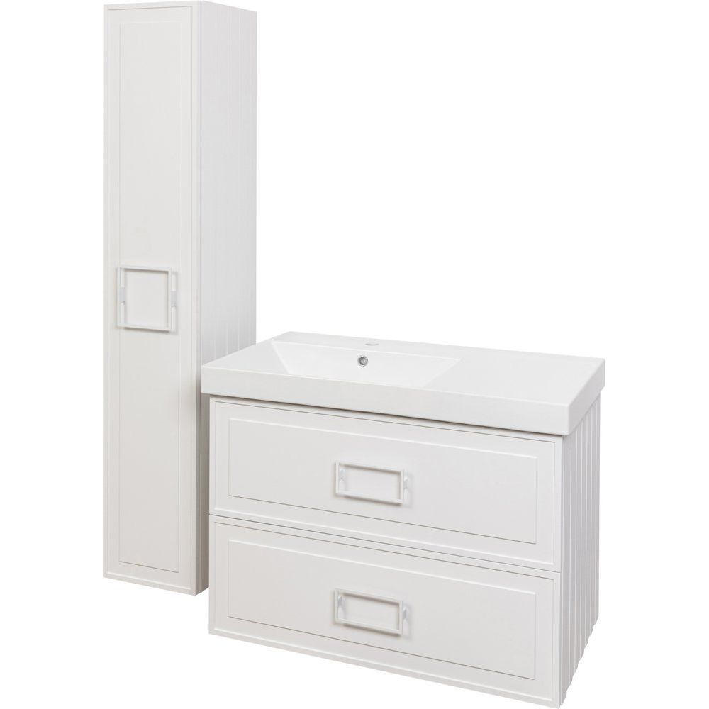 - Тумба: подвесная, с габаритами 87,6x49,4x61,3 см, выполнена из МДФ и покрыта эмалью, оснащена механизмом доводчика для плавного закрывания ящиков.