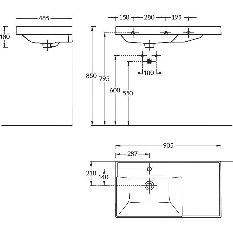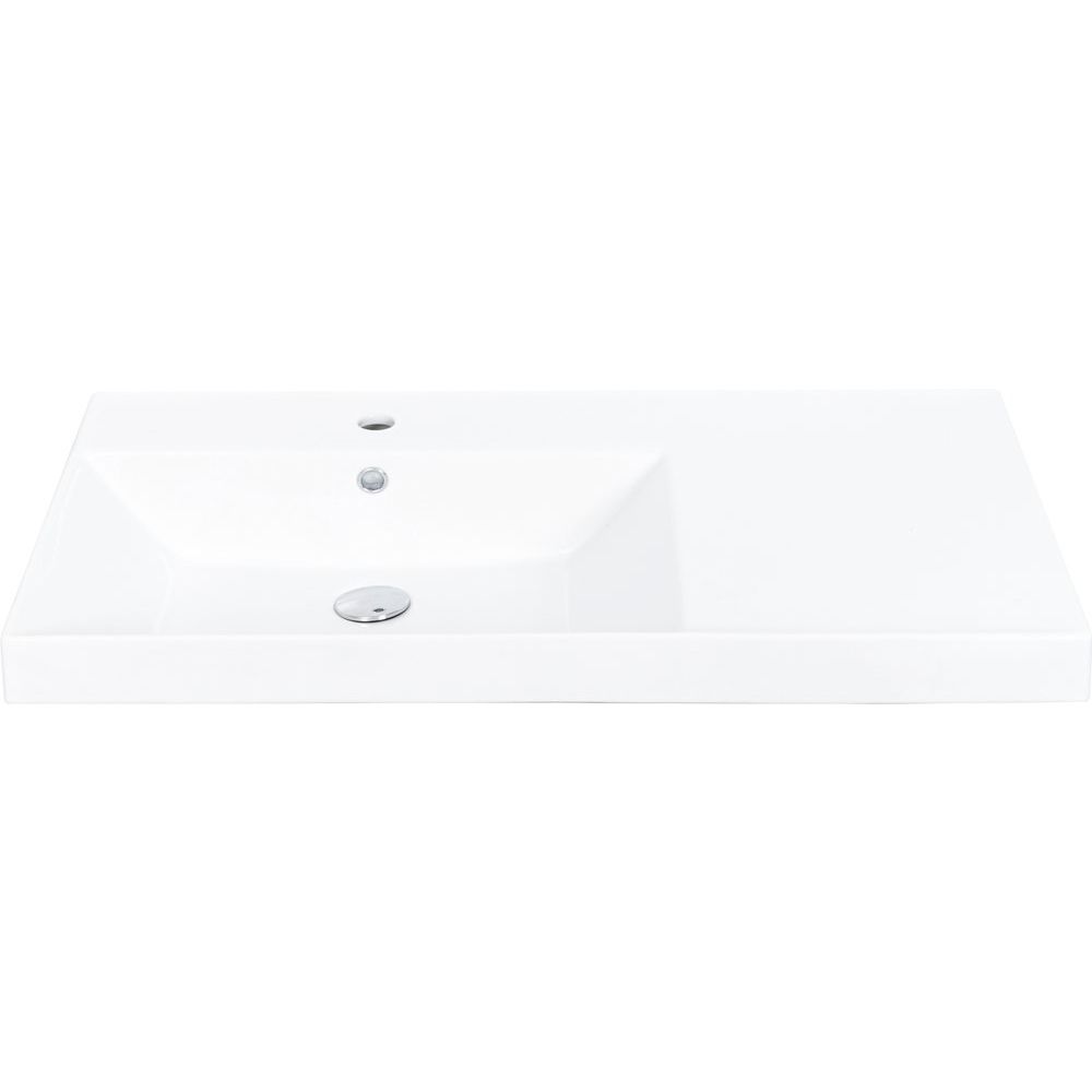 - Мебельная раковина: габариты 90,5x48,5 см, изготовлена из фаянса и подходит для сифона диаметром 3.2 см. Оснащена встроенным сливом-переливом и одним отверстием под смеситель.