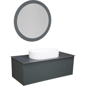 Тумба для комплекта La Fenice Terra 100 выполнена из МДФ с эмалевым покрытием, имеет размеры 95,2x45,5x35 см и оснащена доводчиками для плавного закрывания, а также нажимным механизмом открывания ящиков. Подвесная конструкция обеспечит легкость уборки и элегантный вид. Мебельная раковина La Fenice Senso Matt изготовлена из искусственного мрамора размером 54,4x34,9 см и подходит для сифонов диаметром 4 см. Столешница La Fenice Granite с эффектом черного мрамора имеет размеры 102,1x47x1 см и поставляется с одним готовым отверстием под смеситель. Завершает комплект круглое зеркало STWORKI Молде 100 в антрацитном матовом исполнении с подвесами, выполненное из МДФ с эмалевым покрытием.