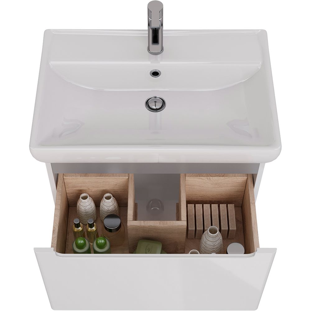 - Тумба Lemark Buno mini 70: Ее размеры 64,4x44,8x39,2 см и она подвесная, что экономит пространство. Внутри — один вместительный ящик, оснащенный механизмом доводчика для плавного закрывания. Изготовлена из ЛДСП с покрытием из эмали и ламината.