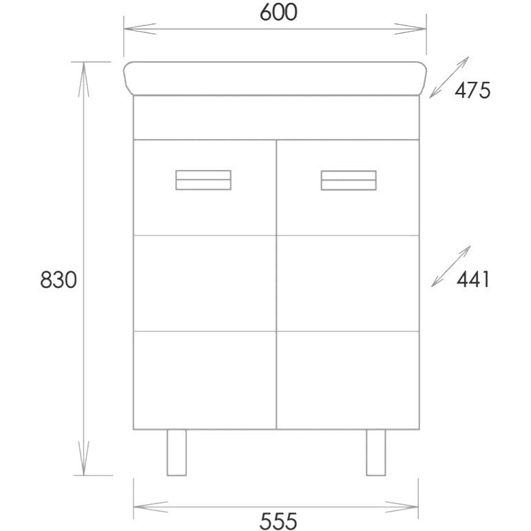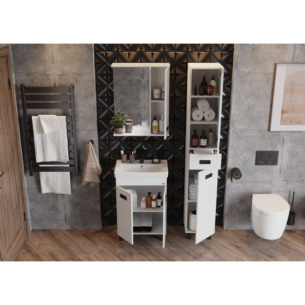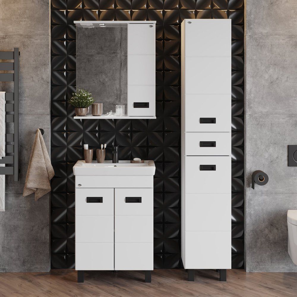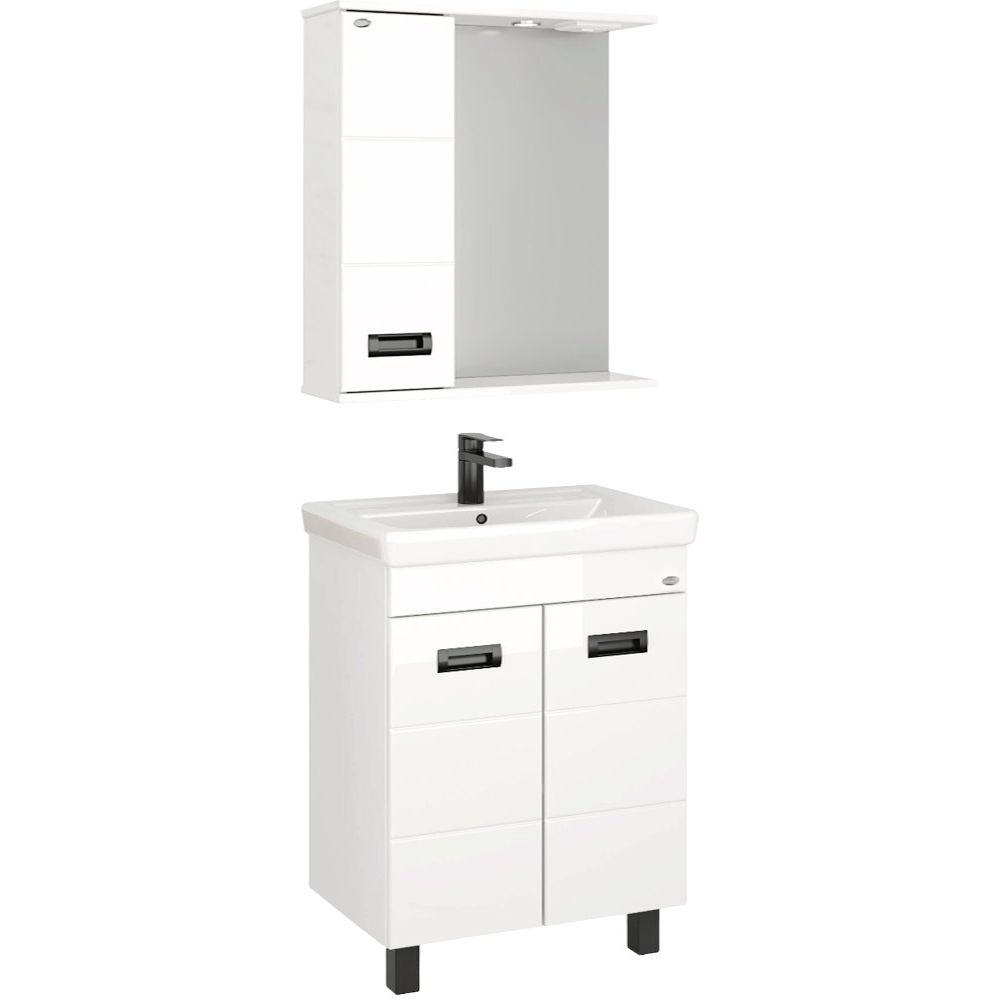Комплект включает в себя напольную тумбу с размерами 55,5x44,1x76 см, выполненную из ЛДСП с ламинатным покрытием и фасадом из пленочного МДФ. Тумба оснащена несъемными полками и отличается плавной работой благодаря механизму доводчика. Зеркало с габаритами 58x16x71,2 см и встроенным электровыключателем дополнено розеткой для удобства пользования. Раковина из фарфора размером 60x47,5 см подвесного типа, рассчитана на сифон с диаметром 3.2 см и имеет одно отверстие под смеситель. Обратите внимание, что донный клапан и слив-перелив приобретаются отдельно.