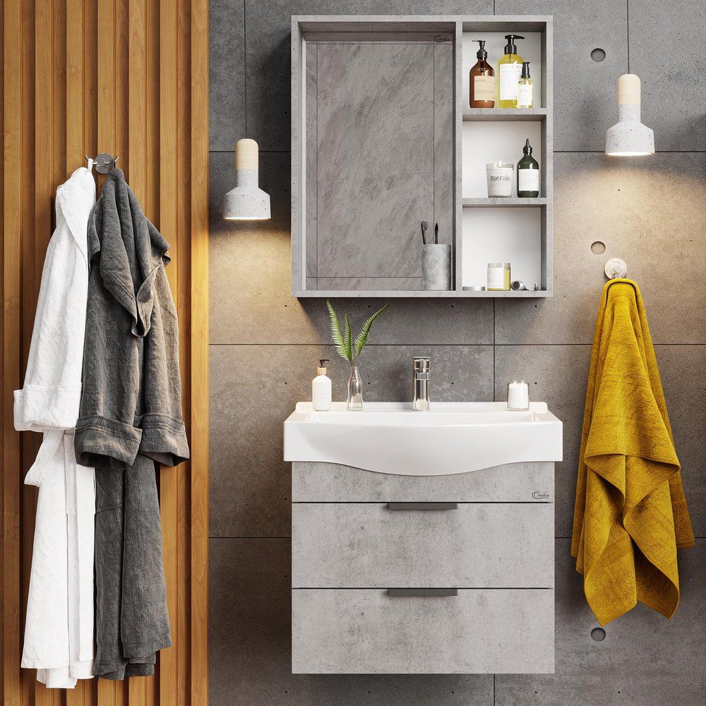 Мебель для ванной комнаты Onika из коллекции "Девис" — это стильное сочетание современного дизайна и функциональности. Гарнитур "Девис 65.13 бетон чикаго" идеально подойдет для тех, кто ценит рациональные решения в интерьере без ущерба для эстетики. Комбинация фактурного бетона и черной фурнитуры придает вашему санузлу элегантный современный вид, а качественные материалы обеспечивают долгий срок службы мебели.
