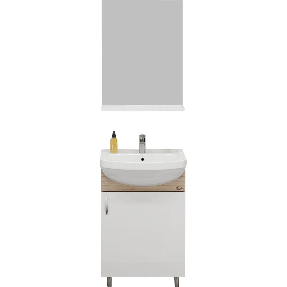 Тумба Onika Эко 52 выполнена из ЛДСП с ламинатным покрытием, что обеспечивает защиту корпуса и фасада. Габариты тумбы составляют 47,38x28,1x68 см, она оснащена дверками и несъемными внутренними полками. Металлическая фурнитура в хромированном исполнении придает изделию дополнительный шарм. Мебельная раковина Santeri Акватон 50 из фарфора отличается прочностью и легкостью ухода. Габариты раковины составляют 52x44 см, она предназначена для сифона диаметром 3.2 см и оснащена встроенным сливом-переливом. Зеркало Onika Эко 52 имеет размеры 52x17x68,4 см и подвесное крепление, дополнено удобной полкой.