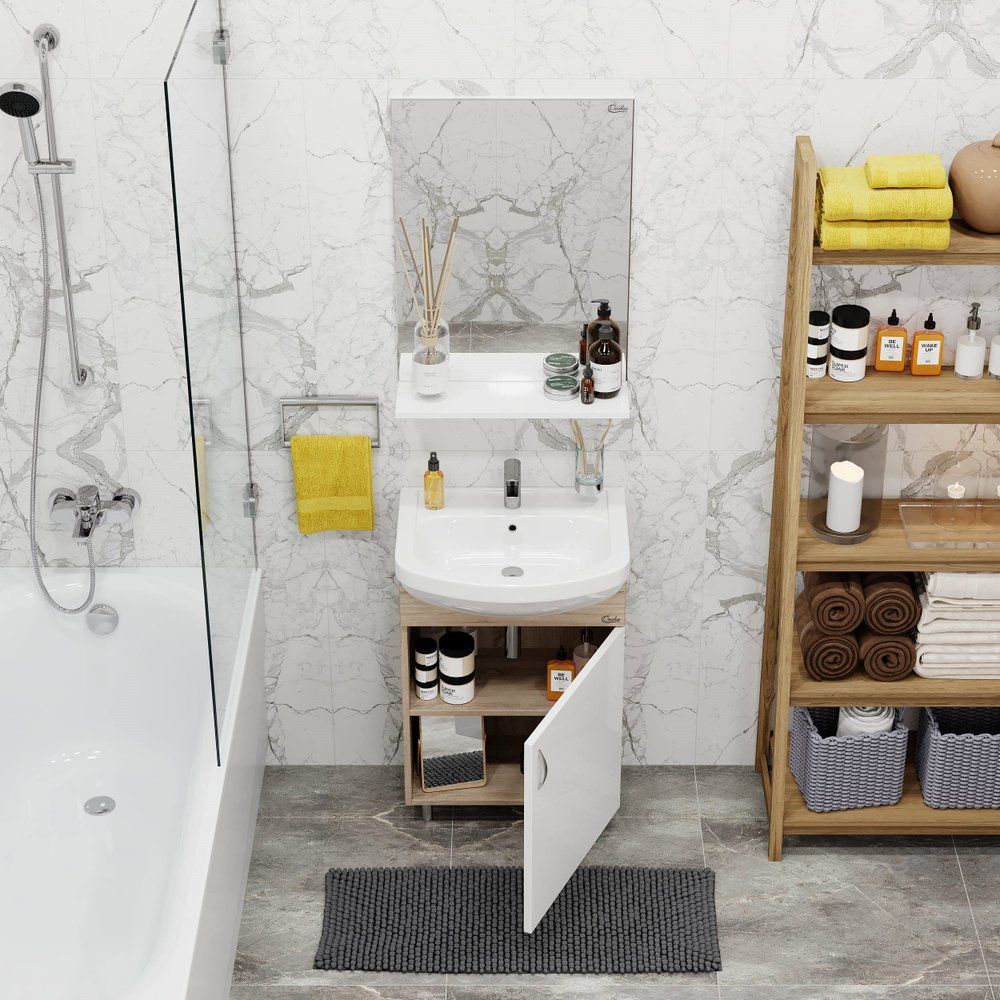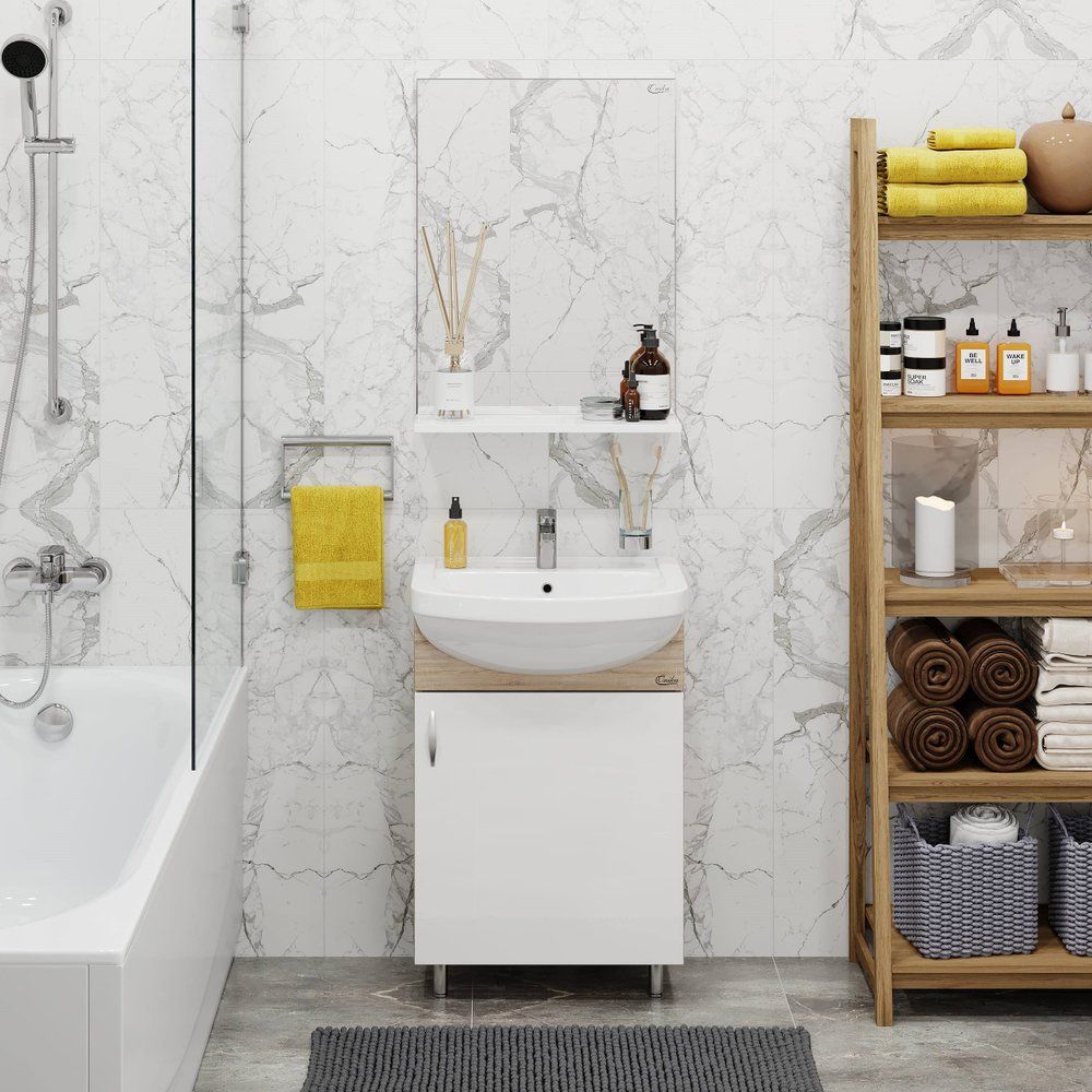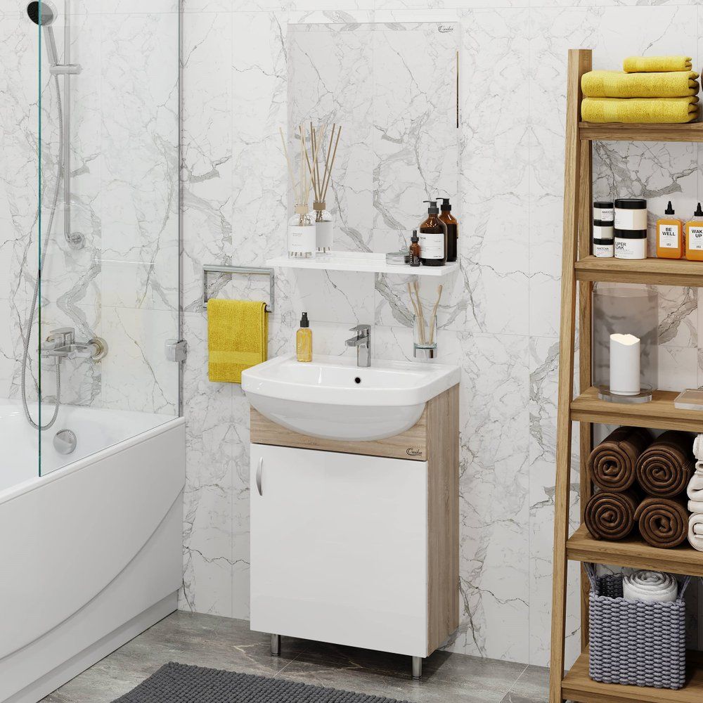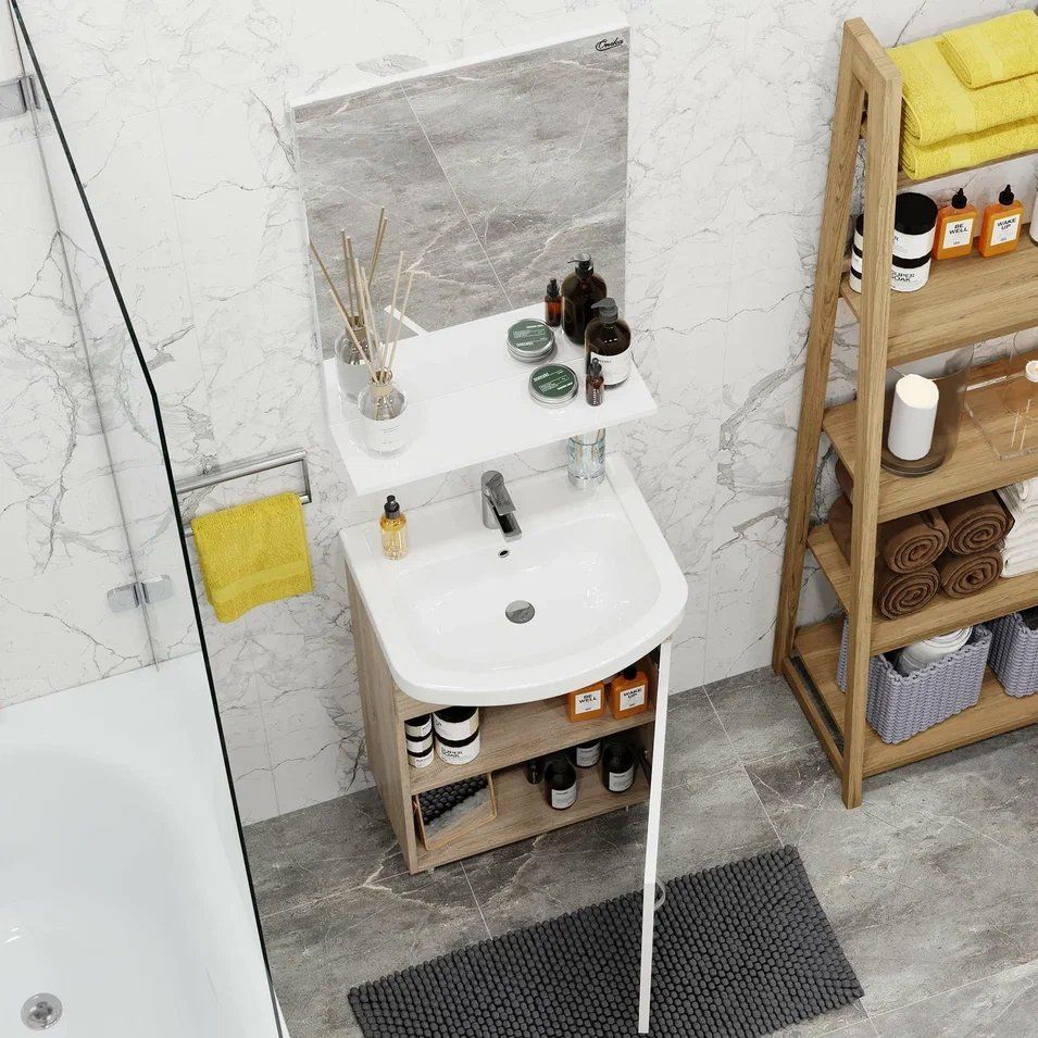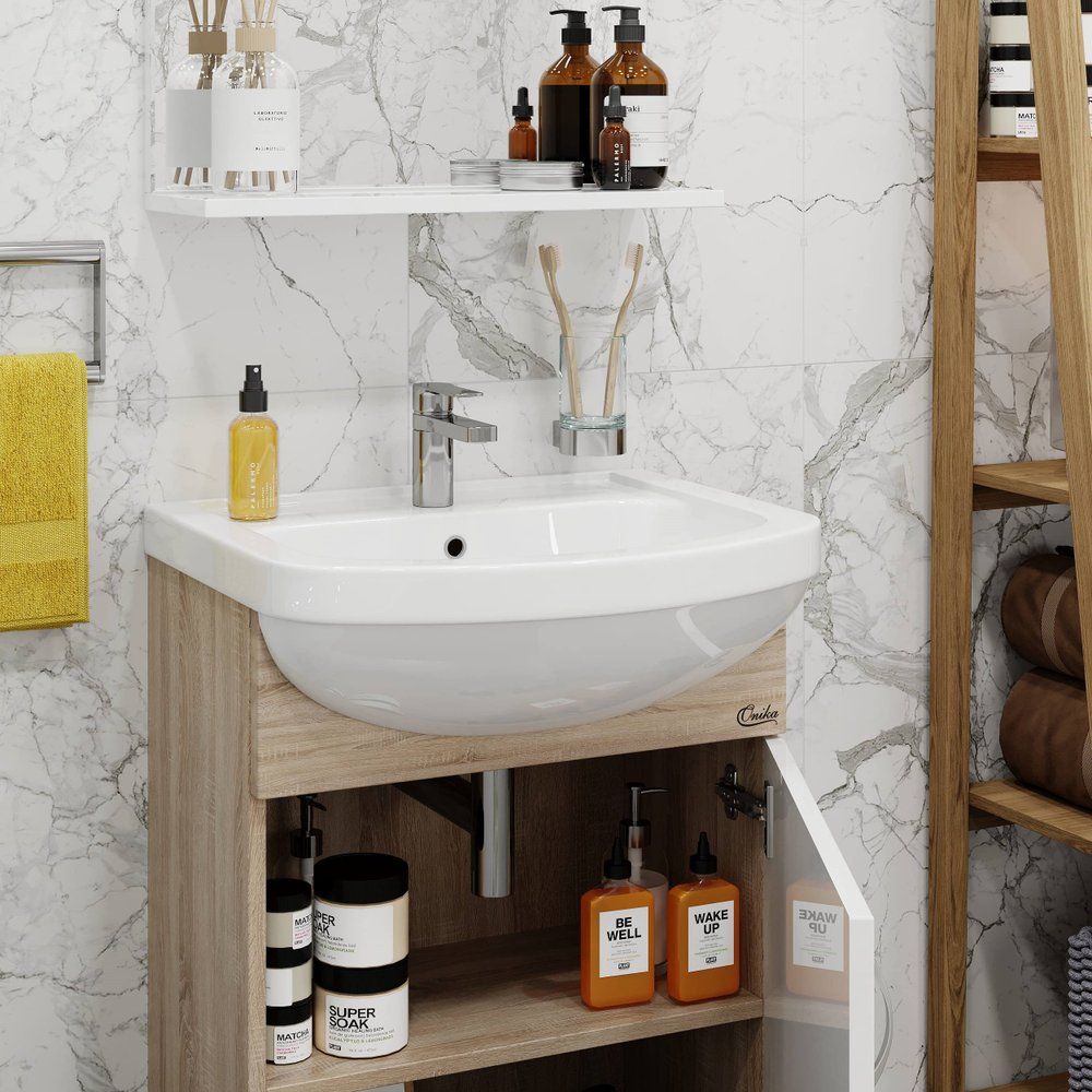 Погрузитесь в атмосферу комфорта и элегантности с мебельным гарнитуром для ванной комнаты Onika Эко 52 в оттенке дуб сонома. Компактный напольный комплект гармонично впишется в интерьер вашей ванной, сочетая в себе стильный дизайн и функциональность. Гарнитур включает в себя тумбу, раковину и зеркало с полкой, что позволяет экономить пространство и обеспечивать максимальное удобство использования. Мебельная раковина, выполненная из высококачественного фарфора, добавляет комплекту изысканности и надежности.