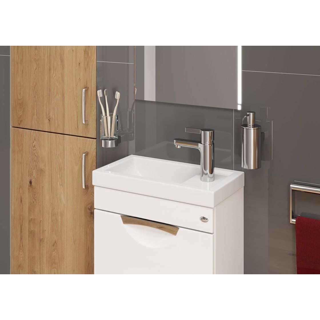 - Тумба для комплекта Onika Комо 45.01: размер 44,8x24,6x55 см, подвесная с механизмом доводчика. Корпус и фасад выполнены из МДФ, покрытие пленочное, хромированная фурнитура. Внутренние полки несъемные. Гарантия — 2 года. Производство — Россия.