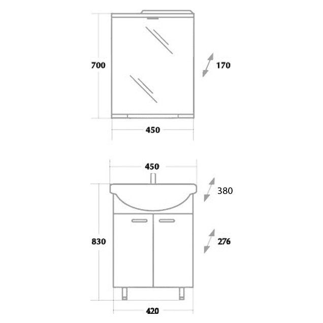 Комплект состоит из тумбы, раковины и зеркала: