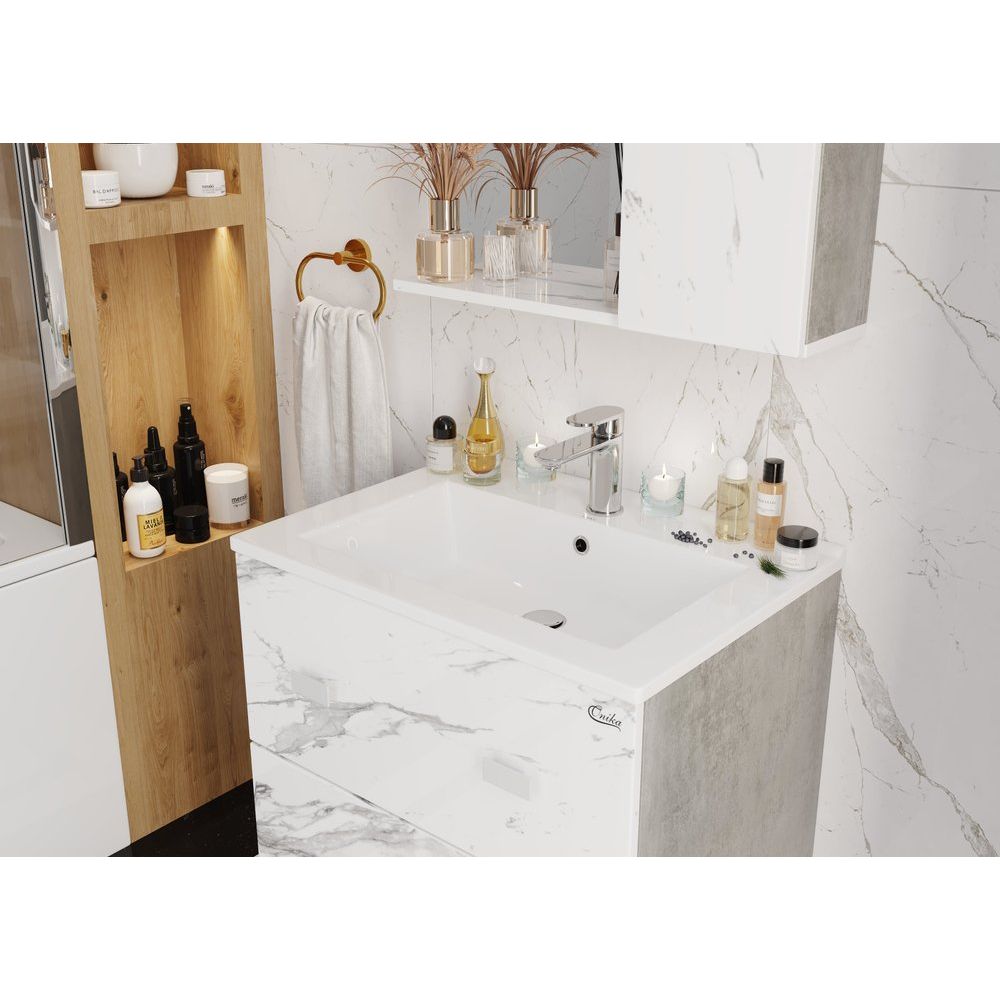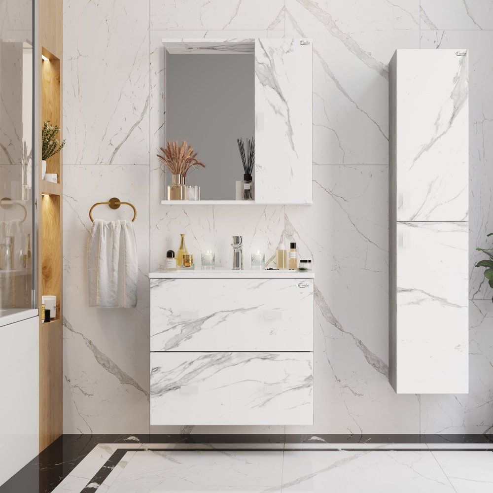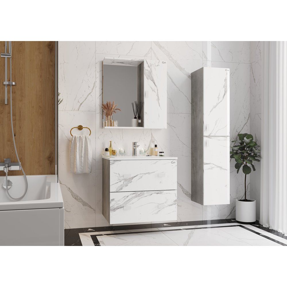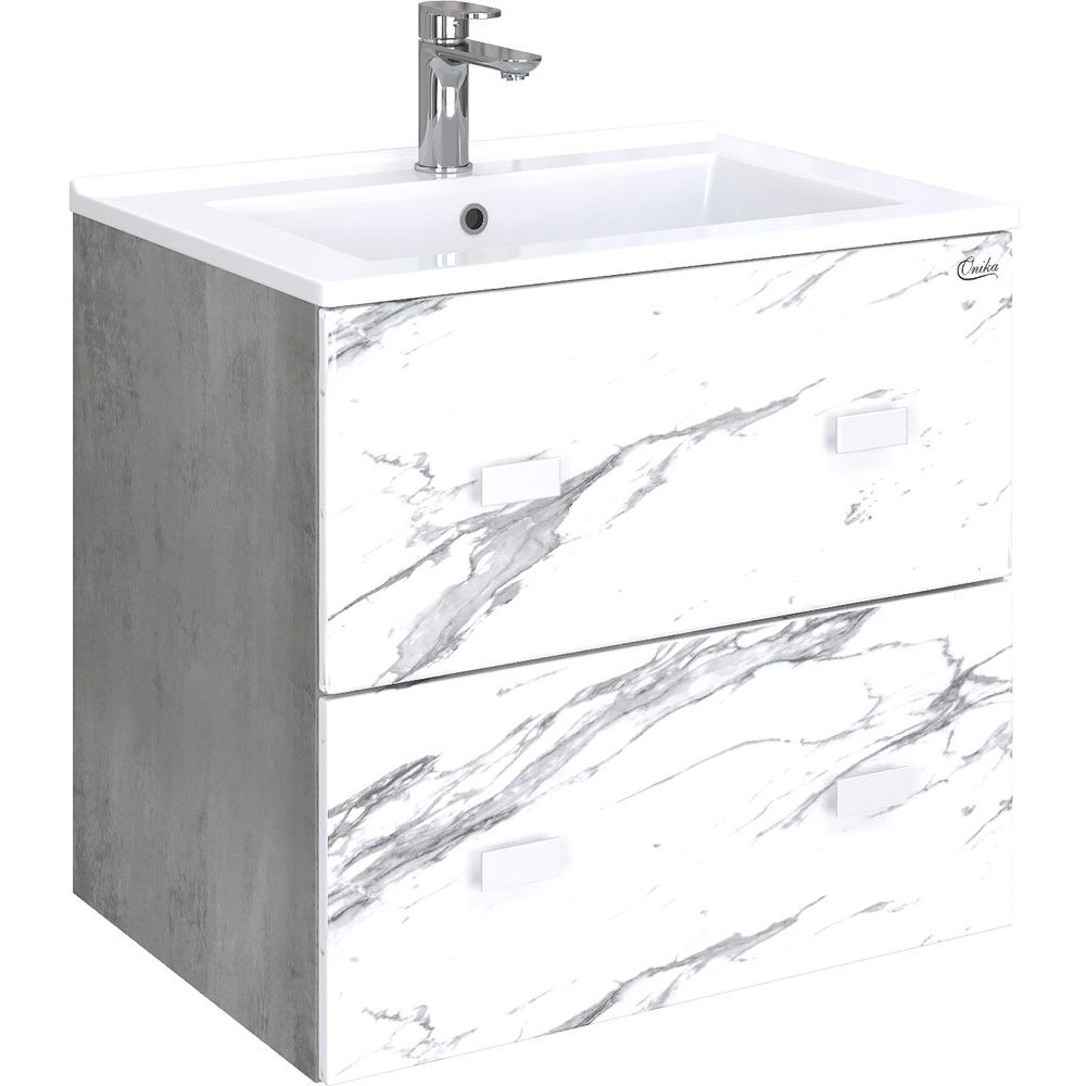 Комплект мебели для ванной комнаты Onika Марбл 65 представляет собой изящное сочетание современных материалов и дизайна. Подвесная конструкция облегчает уборку и создает ощущение простора, а сочетание мрамора и бетонного камня добавляет интерьеру стильный и современный вид. Этот гарнитур - идеальный выбор для тех, кто ценит как эстетические, так и функциональные качества мебели. Включает в себя тумбу, зеркальное полотно и мебельную раковину, выполняя все задачи по организации пространства в ванной комнате.