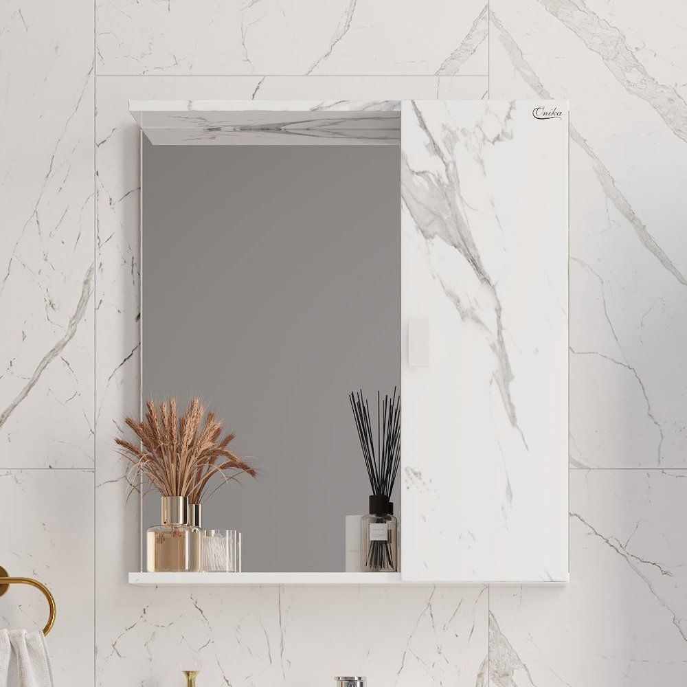 Зеркало Onika Марбл (размеры 65x15,5x71 см) также изготовлено из ЛДСП с ламинатным покрытием. Механизм доводчика поможет избежать резких движений при открытии и закрытии, а встроенные подвесы обеспечат надежное крепление на стене.