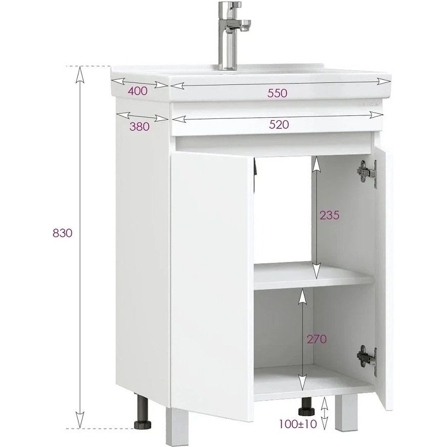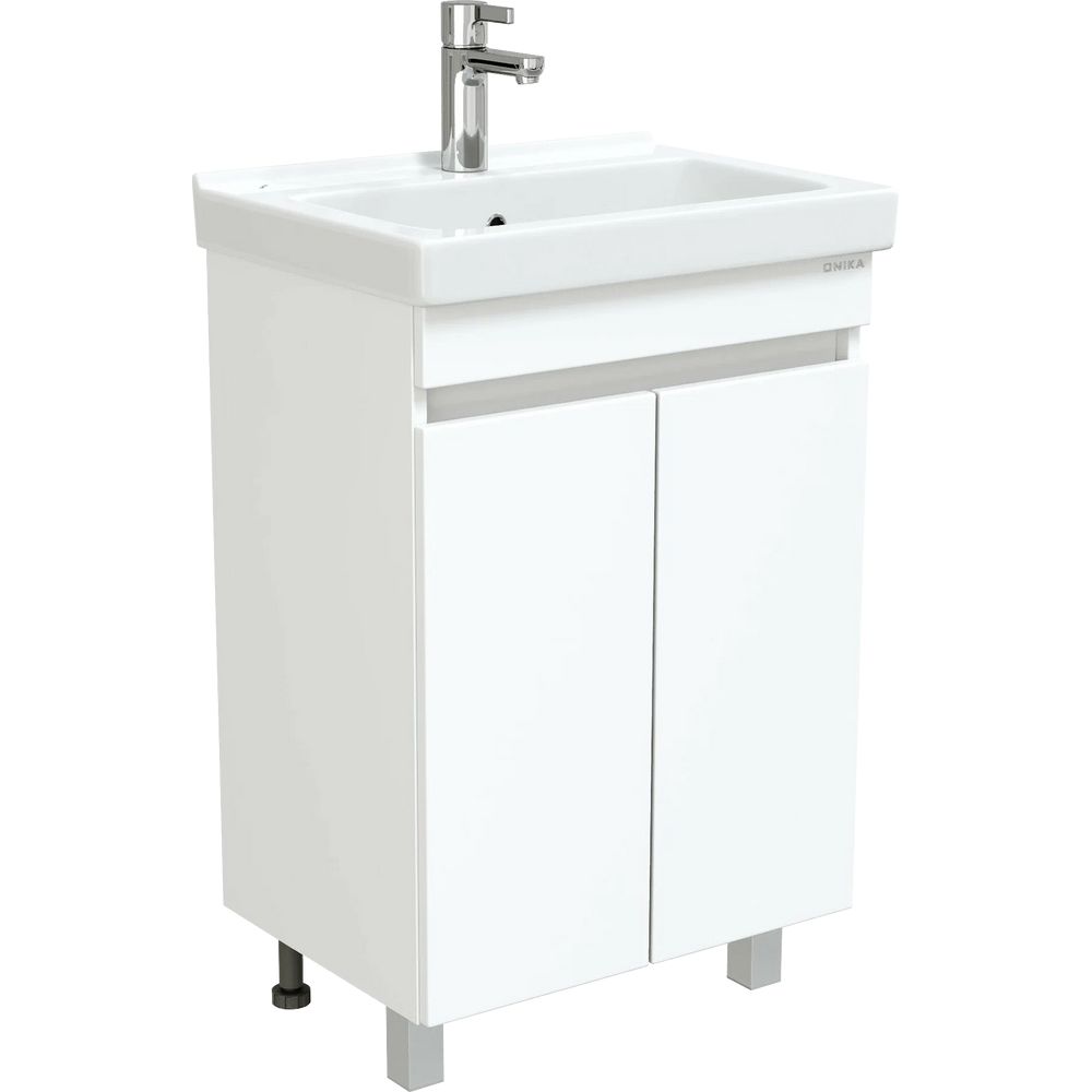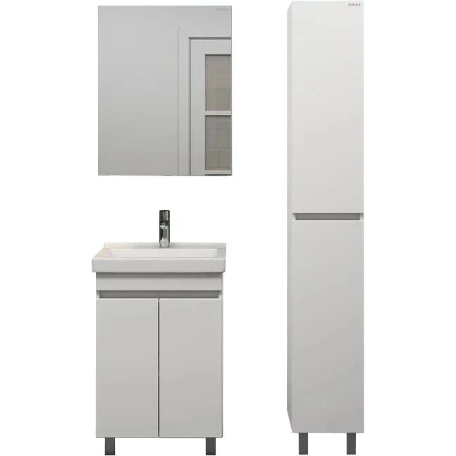 Гарнитур включает в себя тумбу Onika Милтон Квадро 55 с габаритами 52х38х78 см, выполненную из ламинатного ЛДСП с фасадом из пленочного МДФ. Полки внутри тумбы несъемные, а двери обеспечены плавным закрыванием. Раковина Santeri Визит 55, размером 55х40 см, изготовлена из качественного фарфора и оснащена встроенным сливом-переливом. Зеркало-шкаф Onika Венеция У 58, дополненное подвесами и механизмом доводчика, имеет размеры 58х16х73 см и выполнено из ДСП.