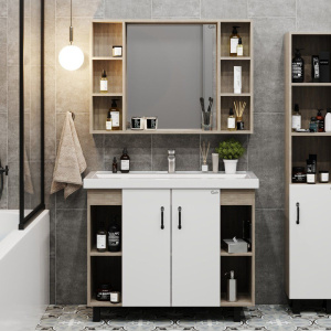 - Полная комплектация: тумба с несъемными полками, мебельная раковина с встроенным сливом-переливом и изысканное зеркало с подвесами.