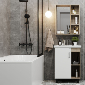 Тумба комплекта имеет размеры 56,5x40x82,5 см и оснащена доводчиком для плавного закрывания, что обеспечивает дополнительный комфорт в использовании. Изготавливается из ЛДСП и ДСП с ламинированным покрытием. Фасады выполнены из МДФ и покрыты пленкой, а стильно выделяющаяся черная фурнитура придаст вашему интерьеру дополнительный акцент.