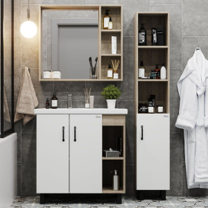 В комплект входит тумба с габаритами 77x45x83 см, выполненная из ЛДСП и ДСП с ламинатным покрытием, со стильной черной фурнитурой. Тумба оснащена дверками и открытыми полками. Мебельная раковина Kirovit Фостер с габаритами 81x45,3 см из фаянса включает встроенный слив-перелив, предусмотрено одно отверстие под смеситель. Зеркало Onika Тимбер У с полкой имеет размеры 80x16x70 см и выполнено из ДСП с ламинатным покрытием. Комплект гарантирован на 2 года, за исключением раковины, гарантия на которую составляет 10 лет. Произведено в России.
