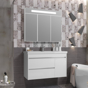 Тумба для комплекта Opadiris Фреш 100 предлагается в размерах 95x42,5x56,5 см и выполнена в подвесном варианте. Корпус из МДФ покрыт эмалью для защиты от влаги, а фасады сочетают МДФ и стекло, покрытые пленкой. Мебельная раковина Opadiris Frame 100 из фаянса дополнена встроенным сливом-переливом и рассчитана для сифона диаметром 3.2 см. Зеркало-шкаф, размером 100x13,7x80 см, также из МДФ, и снабжено подсветкой и механизмом доводчика.