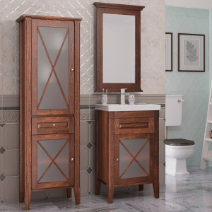 Гарнитур для ванной комнаты Opadiris «Палермо» в светлом орехе — это идеальное решение для тех, кто хочет добавить в интерьер своей ванной изысканный классический стиль, но располагает ограниченным пространством. Изготовленный из массива бука, этот комплект обладает повышенной устойчивостью к влаге и перепадам температуры благодаря матовому покрытию. В нём сочетаются фрезерованные фасады с непрозрачным стеклом и хромированная фурнитура, что подчёркивает его утончённость. Несмотря на небольшие размеры, гарнитур крайне функционален: дверцы оснащены интегрированными доводчиками для плавного движения, а выдвижной ящик открывается лёгким нажатием. Стильная тумба гармонирует с белой раковиной из искусственного мрамора, а в комплекте также идёт зеркало с декоративным карнизом, что придаёт уют и завершённость образу.