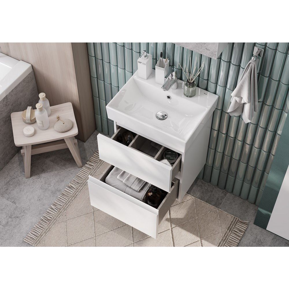Мебель для ванной Roca Oleta 50 в белом глянцевом оформлении — это идеальное решение для создания современного и стильного интерьера вашей ванной комнаты. Изделия из этой коллекции сочетают в себе изысканную эстетику и высокую функциональность, обеспечивая комфортное использование на протяжении многих лет. Особенное внимание уделяется деталям: ящики тумбы оснащены направляющими Hettich с внутренней отделкой в элегантном бежевом текстиле.