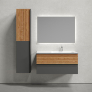 Мебель для ванной Sancos Delta 100 R в стильных оттенках дуба красного и графита полностью преобразит интерьер вашей ванной комнаты. Этот гарнитур сочетает в себе элегантный дизайн и функциональность, создавая атмосферу уюта и комфорта. Основная часть гарнитура — это подвесная тумба, выполненная из высококачественного МДФ с прочным пленочным покрытием, которое защищает её от влаги и повреждений. В комплект также входят изящная раковина от итальянского производителя Ceramicanova и современное сенсорное зеркало с подсветкой.