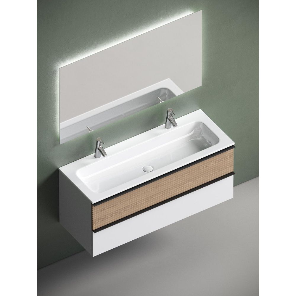 - Тумба Sancos Delta 120 с габаритами 119,5x44,5x50 см, выполненная в светлом дубе и белом цвете. Подвесная конструкция обеспечивает модерновый вид и легкость уборки. Черная матовая фурнитура добавляет стиля. С механизмом доводчика, который обеспечивает плавное закрытие ящиков.