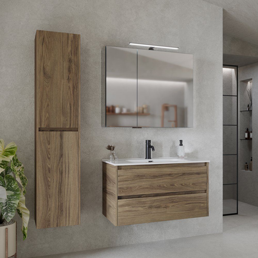 Набор мебели для ванной комнаты Sancos Libra в цвете дуб чарльстон — это идеальное решение для тех, кто ценит элегантность и практичность в интерьере. Комплект включает в себя подвесную тумбу, раковину из фаянса и стильное зеркало с подсветкой. Гарнитур подчеркнет современный стиль вашей ванной комнаты и обеспечит комфортное хранение.