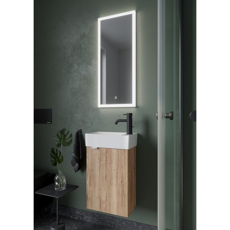 Тумба гарнитура Sancos Mini 35 R изготовлена из прочной ЛДСП с ламинатным покрытием, которое защищает поверхность от влаги и механических повреждений. Ее размеры составляют 35,5x20,5x50 см, что идеально подходит для компактных помещений. Зеркало Sancos Polo PL 35 с подсветкой, выполненное с использованием пластика и оснащенное сенсорным выключателем, добавляет функциональности и современности. Рукомойник Ceramicanova Element CN5007 R из фаянса обеспечивает практичность и имеет отверстие под смеситель.