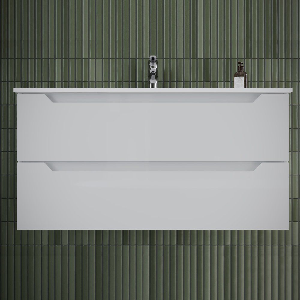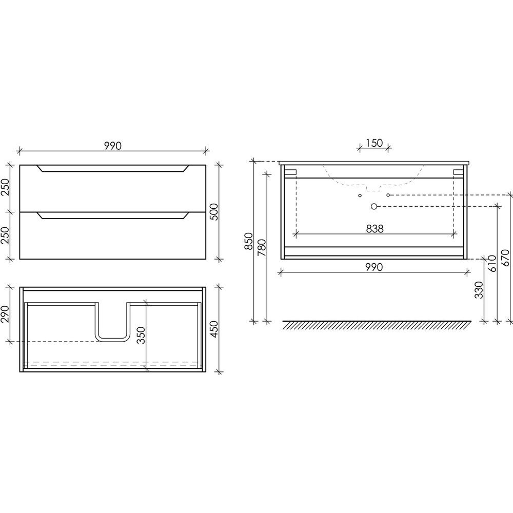 Гарнитур включает в себя тумбу Sancos Norma 2.0, размеры которой составляют 99x45x50 см, выполненную из ЛДСП и МДФ с ламинированным покрытием и эмалью. Она подвесная и оснащена ящиками с механизмами доводчика для плавного закрывания. Раковина Ceramicanova Element CN7003 встраивается сверху и изготовлена из итальянского фаянса. Её размеры 101x46,5 см, она оснащена встроенным сливом-переливом и рассчитана на сифон диаметром 3.2 см. Зеркало Sancos Arcadia 1.0 имеет размеры 100x2,5x70 см, выполнено из пластика и оснащено регулируемой подсветкой, часами, датчиком температуры и сенсорным выключателем.
