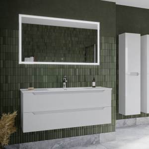 Тумба Sancos Norma 2.0 шириной 119 см, обладает корпусом из ламинированного ЛДСП и фасадом из эмалированного МДФ, что обеспечивает повышенную износостойкость. Оснащена доводчиками для плавного закрывания ящиков. Раковина Ceramicanova Element CN7006, изготовленная из фаянса, имеет размеры 121x46,5 см, комплектуется встроенным сливом-переливом и рассчитана на сифон диаметром 3,2 см. Зеркало Sancos Palace 120 из пластика, с габаритами 120x2,5x70 см, отличается наличием сенсорного включения, регулируемой подсветкой и лёгкостью монтажа.