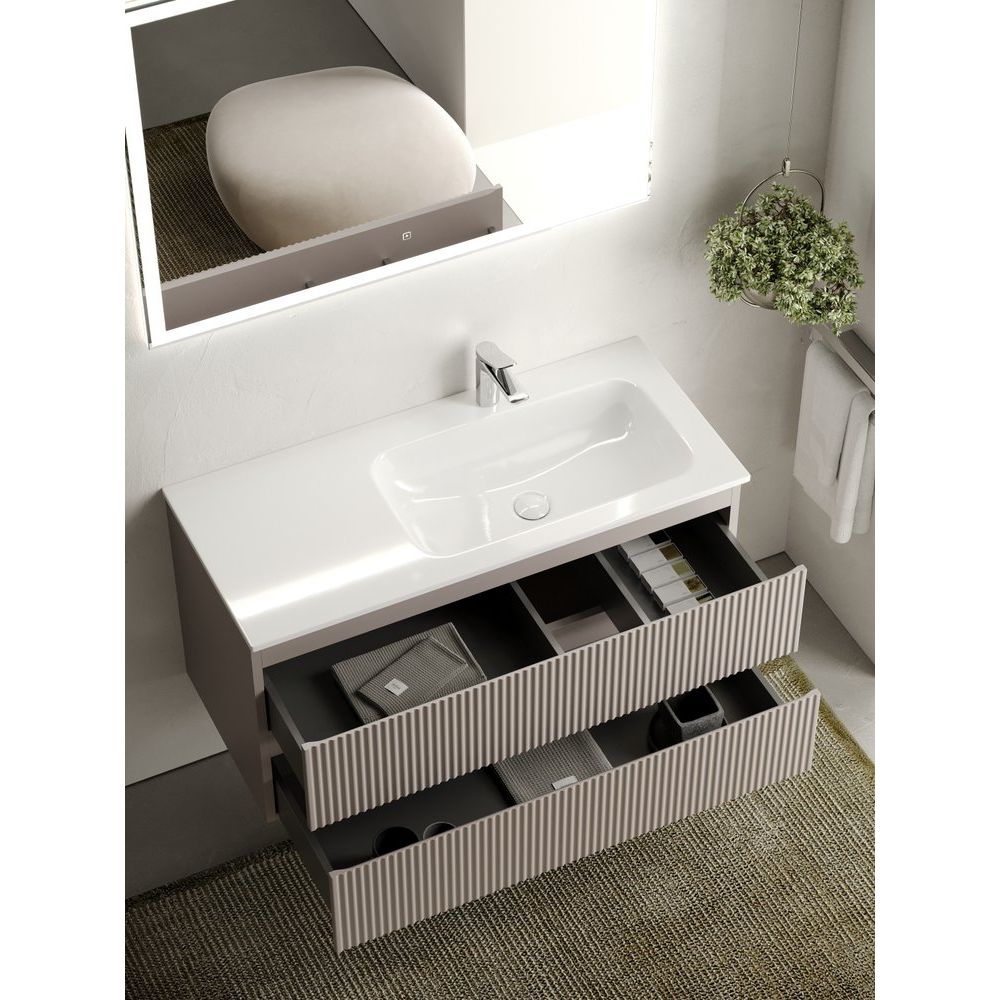 - Тумба Sancos Snob R 100: выполнена из МДФ с пленочным покрытием, имеет размеры 99,5x44,5x50 см и подвесную конструкцию, что делает уборку пространства лёгким делом.