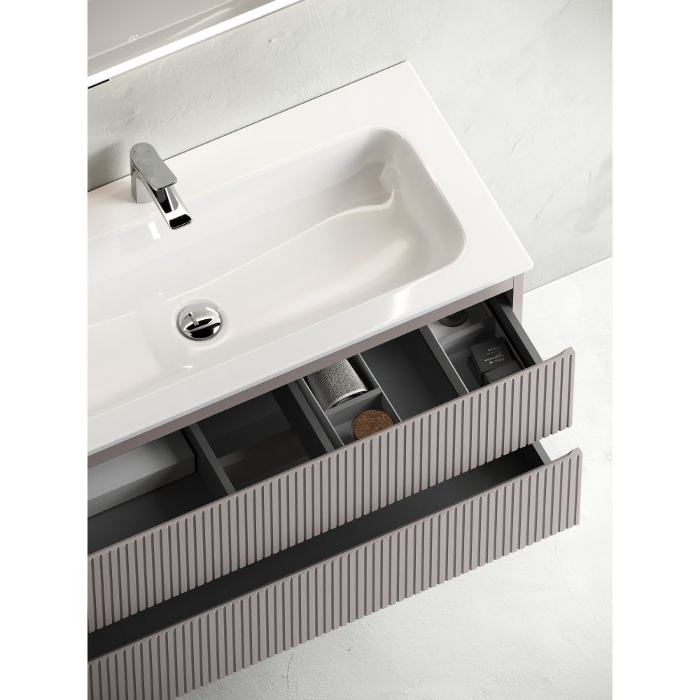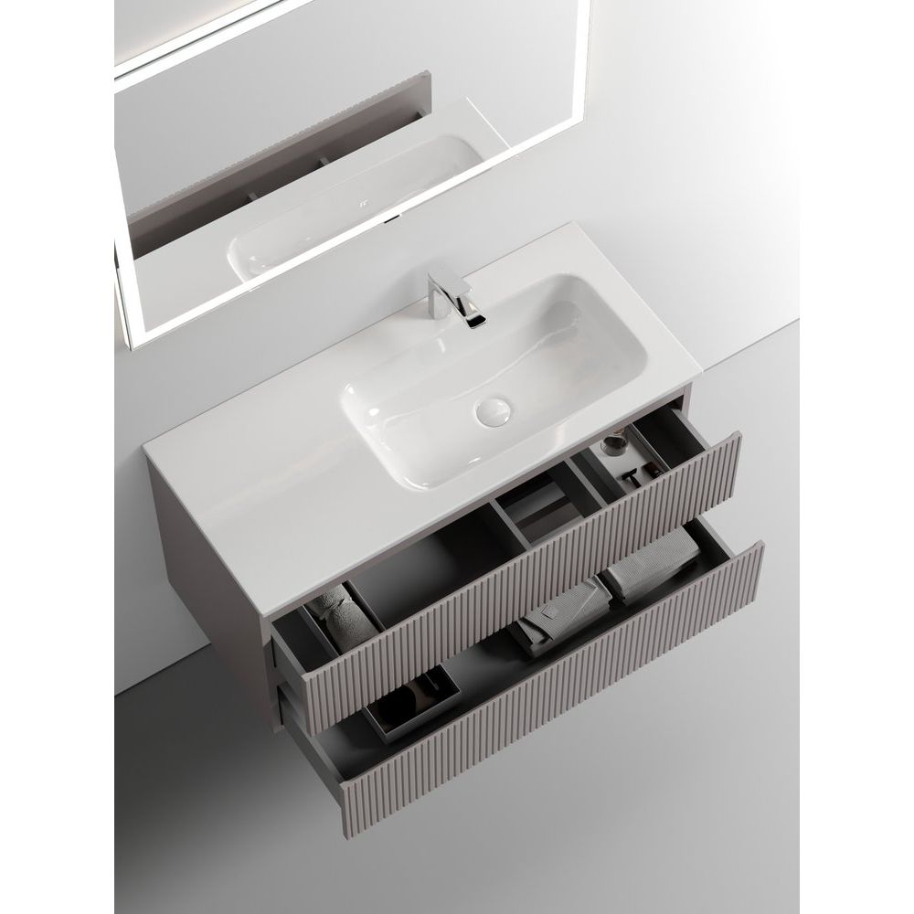 Комплект начинается с подвесной тумбы размером 99,5x44,5x50 см, изготовленной из прочного МДФ, покрытого пленкой для дополнительной защиты и стильного внешнего вида. Для еще более точного контроля плавности закрывания, она имеет встроенные доводчики. Раковина Ceramicanova Element CN7015 из итальянского фаянса (101x45,7 см) идет в комплекте и рассчитана под сифон диаметром 3,2 см. Обратите внимание, что донный клапан нужно приобрести отдельно. Зеркало Sancos City CI1000 с подсветкой, управляемой лёгким прикосновением, становится неотъемлемой частью ансамбля, обеспечивая современный интерьер ванной комнаты.