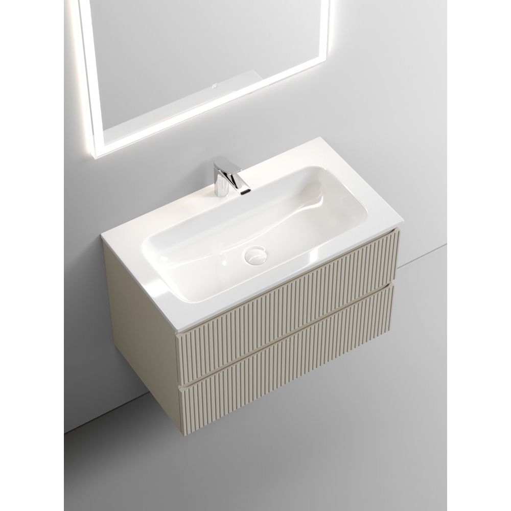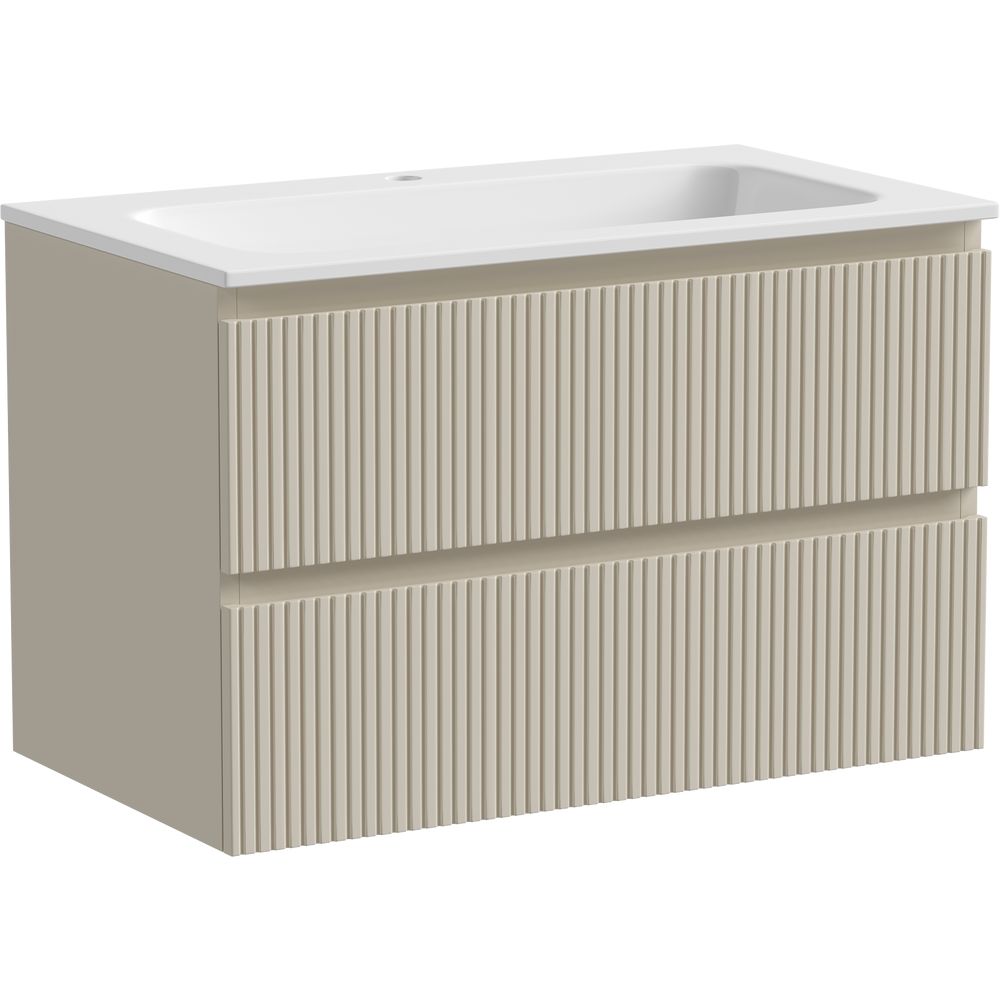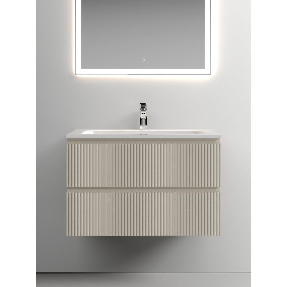 Тумба для комплекта Sancos Snob T 80, beige soft: ширина 79 см, глубина 44,5 см, высота 50 см. Этот подвесной шкаф изготовлен из МДФ, покрытого пленкой, с ящиками, оснащенными механизмом доводчика.