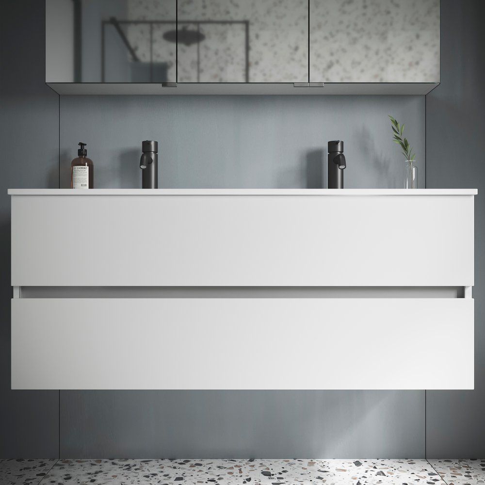 В комплект входит подвесная тумба Sancos Urban с размерами 119x45x55 см, выполненная из ЛДСП и покрытая ламинатом, а фасад из МДФ с эмалевым покрытием. Тумба оснащена доводчиками, что обеспечивает плавное закрывание ящиков. Раковина Ceramicanova Element CN7004 (121x46,5 см) из итальянского фаянса представлена встраиваемой сверху конструкции и включает встроенный слив-перелив. Она поддерживает установку сифонов диаметром 3.2 см и имеет 2 готовых и 4 намеченных отверстия под смесители. Зеркало Sancos City CI1200 с размерами 120x2,5x70 см, выполнено из пластика, включает регулируемую подсветку и сенсорный выключатель.