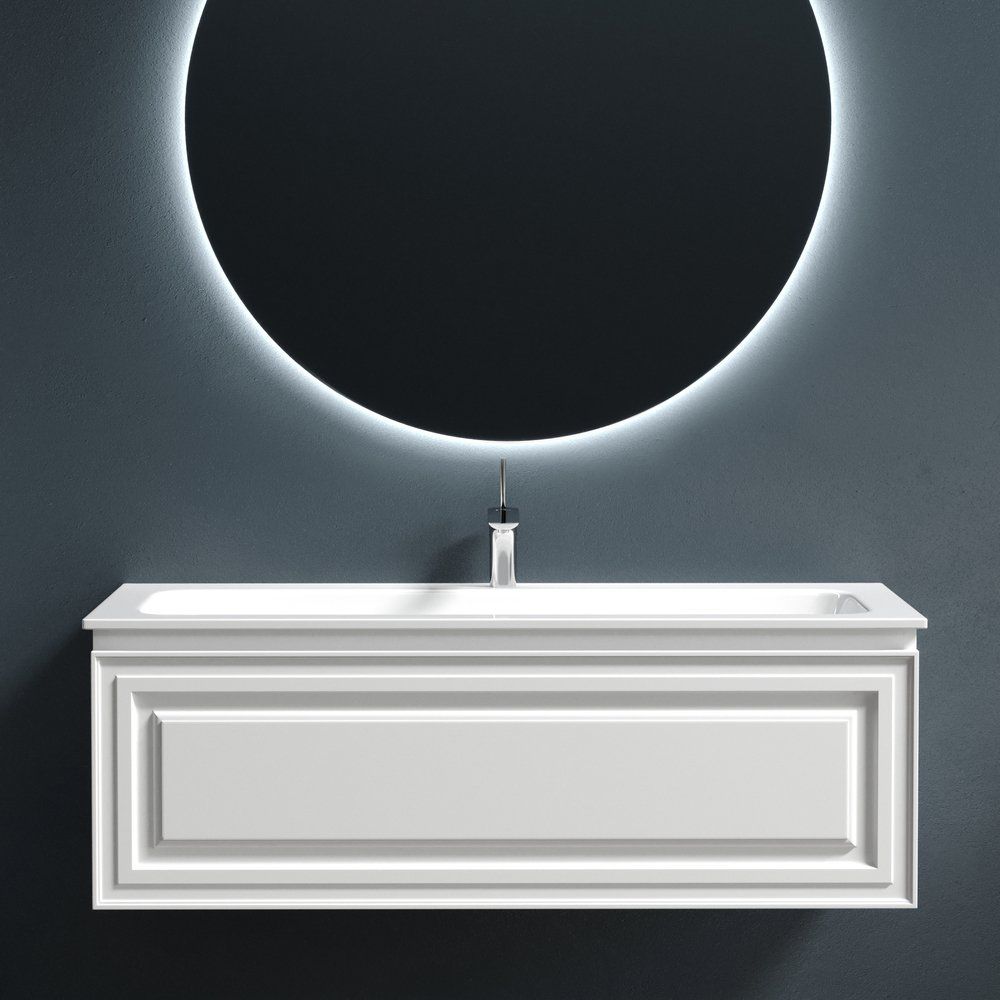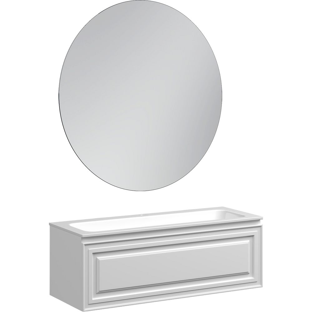 Тумба из коллекции Sancos Very изготовлена из МДФ, покрытого пленкой, отличается подвесной конструкцией и оснащена механизмом плавного закрывания ящиков. Габариты тумбы составляют 119,5x44,5x37,5 см, что обеспечивает оптимальное использование пространства. Раковина Ceramicanova Element CN7017 выполнена из прочного фаянса, имеет размер 121x45,7 см и одно отверстие под смеситель. Зеркало Sfera диаметром 100 см снабжено подсветкой за полотном и управлением с помощью сенсорной кнопки. На тумбу и зеркало распространяется гарантия 2 года, а на раковину — 10 лет.