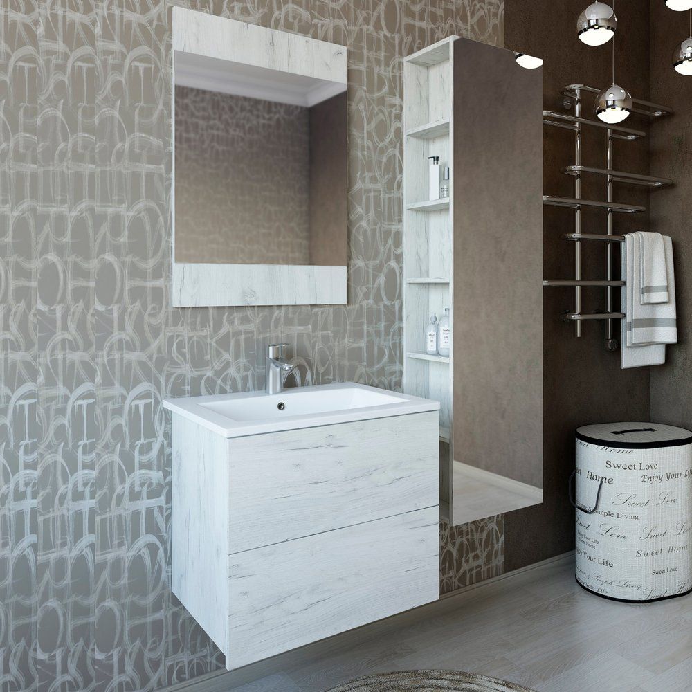 Тумба имеет компактные размеры 63,6x45,6x51,2 см, что идеально подходит для небольших ванных комнат. Она оснащена ящиками с нажимным механизмом открывания, что позволяет комфортно и быстро использовать пространство для хранения. Корпус и фасад выполнены из надежного ЛДСП, покрытого ламинатом, что обеспечивает долгосрочную эксплуатацию.